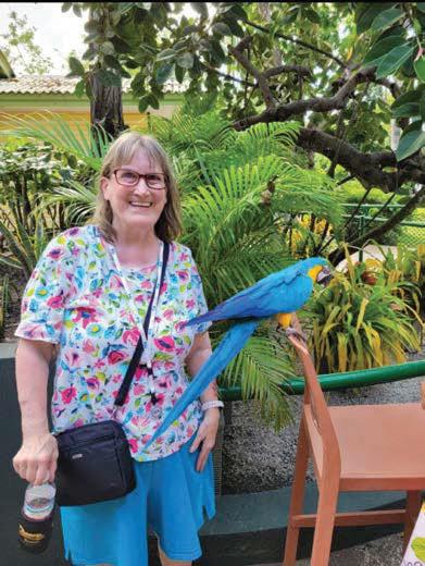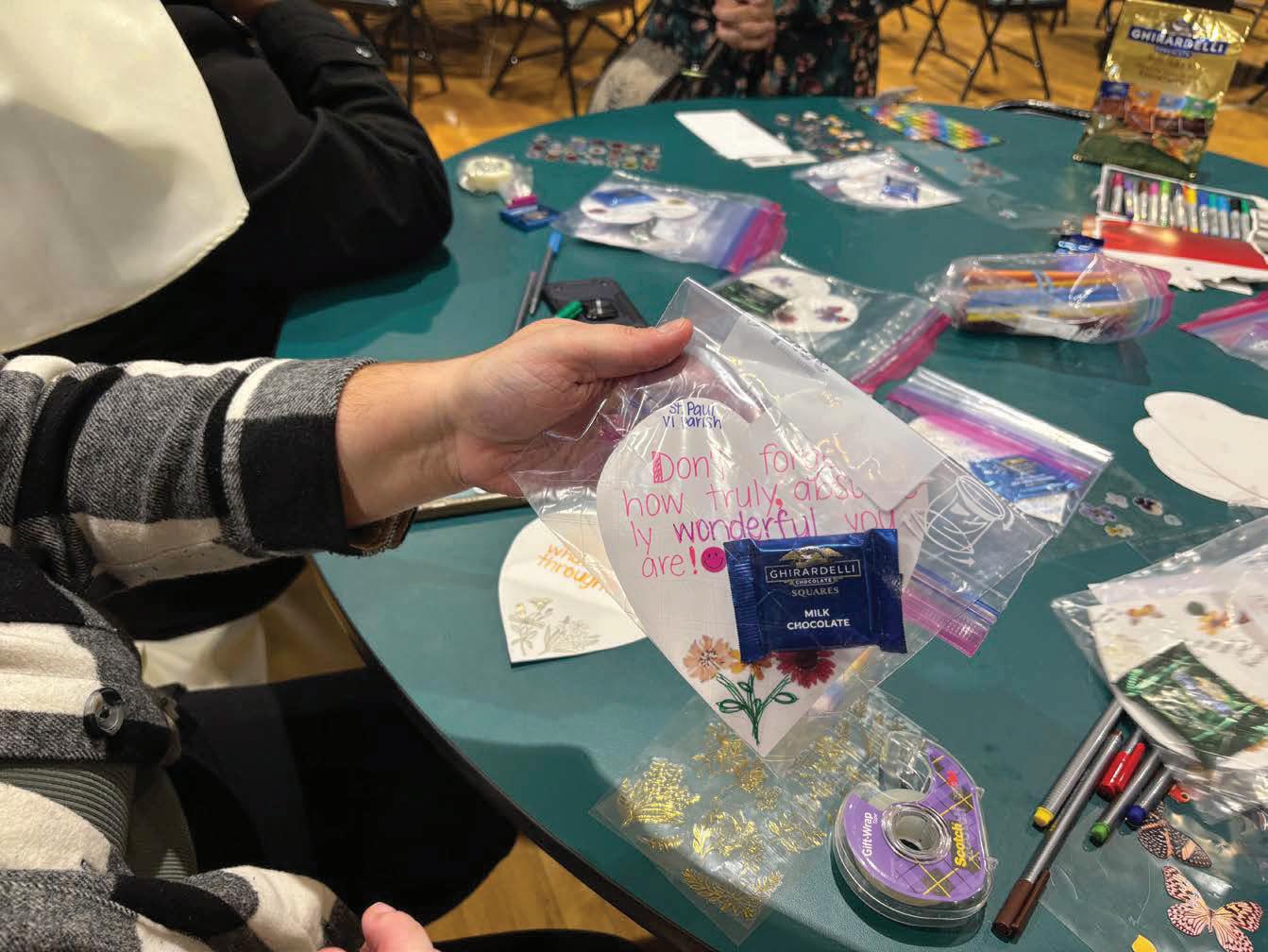Pat Cu ev as, a for mer Rive rsider wh o still attends St. Mar y, acted as the c oordinator for volunteers who we re assembling laundry kits for BEDS Plus. Sh e said the volunteers we re p utting to g ether baggies that each c ontained two laundry d etergent pods, two dryer sheets and a blessing note for the recipient.