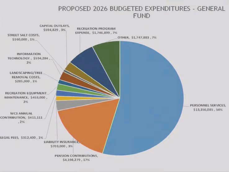 Of the $24.6 million in general fund expenditures for 2026, about 70% are related to personnel costs, Cooper said. Some $13.4 million, or 54%, will be paid out to employees in their salaries and benefits, with another $4.2 million, or 17%, going to pension contributions