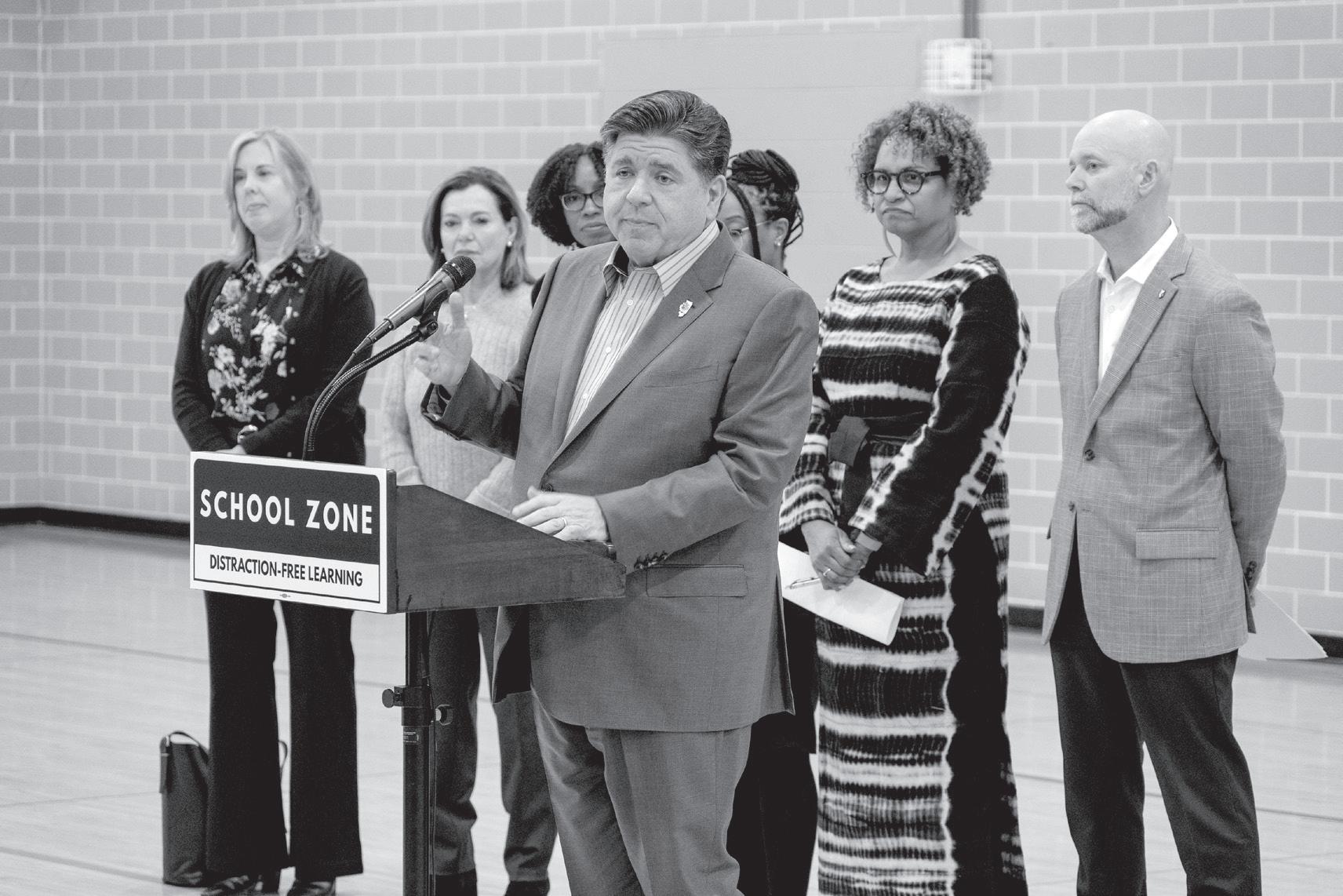 “Strong schools are the foundation to our success as a state. This year, I am proposing legislation that requires school districts to adopt a cellphone policy that keeps students focused on the work in class,” Pritzker said during an hour-long event at the school’s west gym that drew about 50 people, including 25 student leaders. “We owe it to our kids to cultivate the healthiest, most productive learning environment possible – this proposal will help us do just that.”