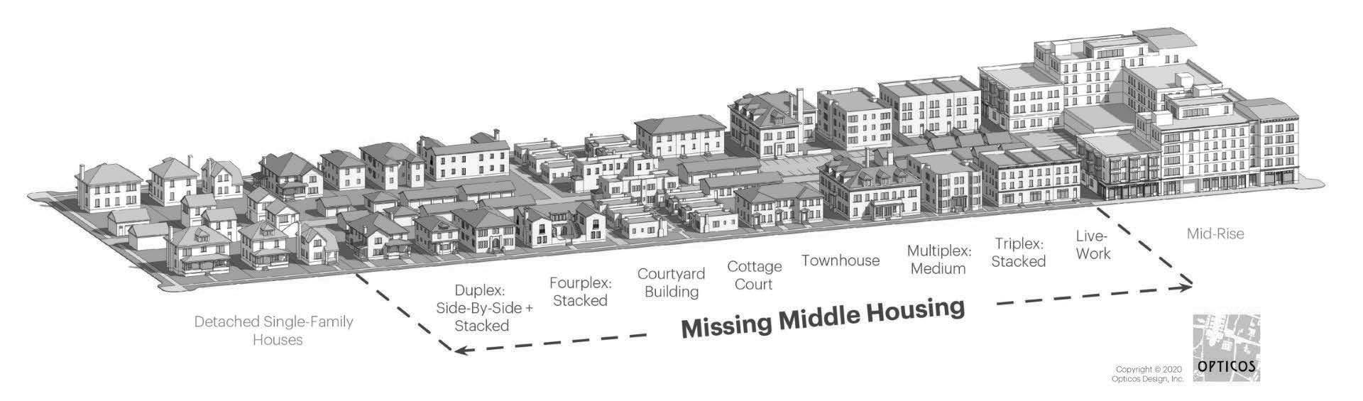 Missing middle housing is defined as “a range of house-scale buildings with multiple units – compatible in scale and form with detached single-family homes – located in a walkable neighborhood.” It usually looks like duplexes, triplexes or small apartment buildings that can accommodate a few families, often in blocks that also have single-family homes.
