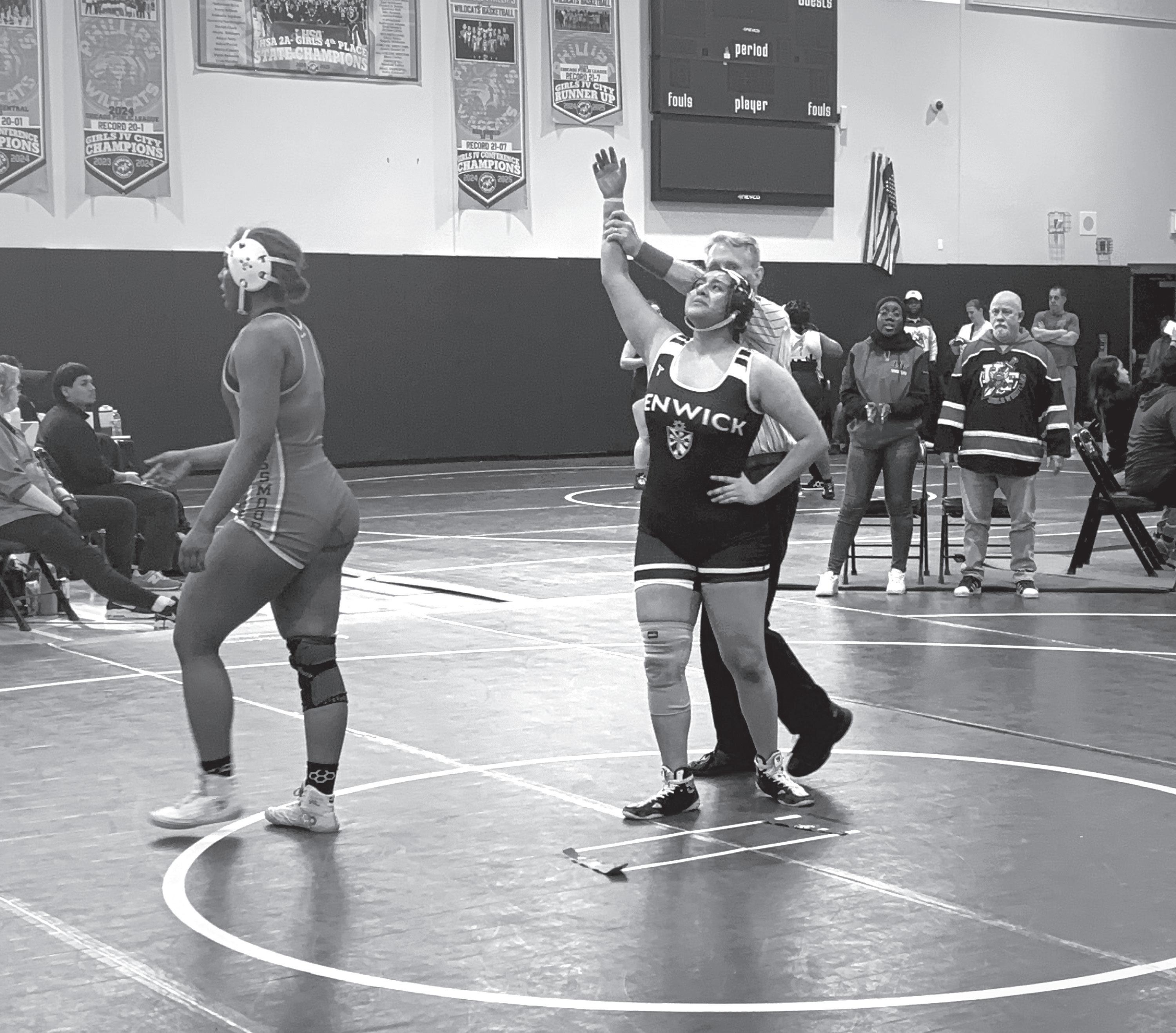 Fenw ick’s Valerie Franco had her hand raised in victor y a er defeating HomewoodFlossmoor’s Kendra Hayden 7-4 in a 190-pound girls wrestling sectional semi nal at Phillips on Februar y 14. Franco went on to win the title, becoming the rst girls wrestler from Fenwick to qualif y for the state tournament
