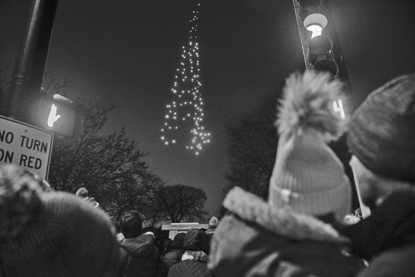 Crowds packed Lake Street at Oak Park Avenue, Saturday evening, to watch the Holiday Drone Light Show over Scoville Park. e show was scheduled to make up for the canceled Fourth of July reworks, following the mass shooting in Highland Park.