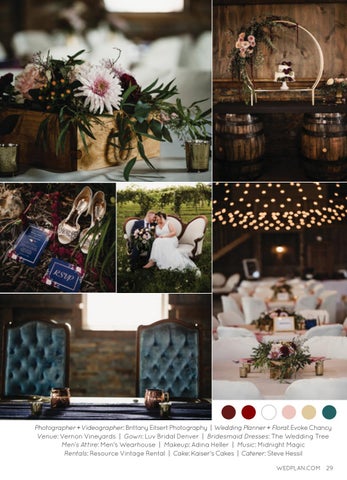 Photographer + Videographer: Brittany Eitsert Photography | Wedding Planner + Floral: Evoke Chancy Venue: Vernon Vineyards | Gown: Luv Bridal Denver | Bridesmaid Dresses: The Wedding Tree Men's Attire: Men's Wearhouse | Makeup: Adina Heller | Music: Midnight Magic Rentals: Resource Vintage Rental | Cake: Kaiser's Cakes | Caterer: Steve Hessil WEDPLAN.COM 29