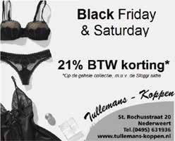 Gemeenten en waterschap onthullen beste drie ideeën ‘Lang leve planeet aarde’ Prijswinnaars krijgen prominente plaats in museumexpositie *vraag in de winkels naar de voorwaarden Kerkstraat 36 Nederweert www.durlinger.com 20% korting op de hele collectie minimaal Black Friday Week Geldt op alle kleding met een sticker BIJ AANKOOP VAN 2 ARTIKELEN 25% BIJ AANKOOP VAN 1 ARTIKEL 20% 30% BIJ AANKOOP VAN 3 ARTIKELEN VERBOUWINGSOPR UIMING Laat je stralen! 135JAAR KIES JE EIGEN VOORDEEL