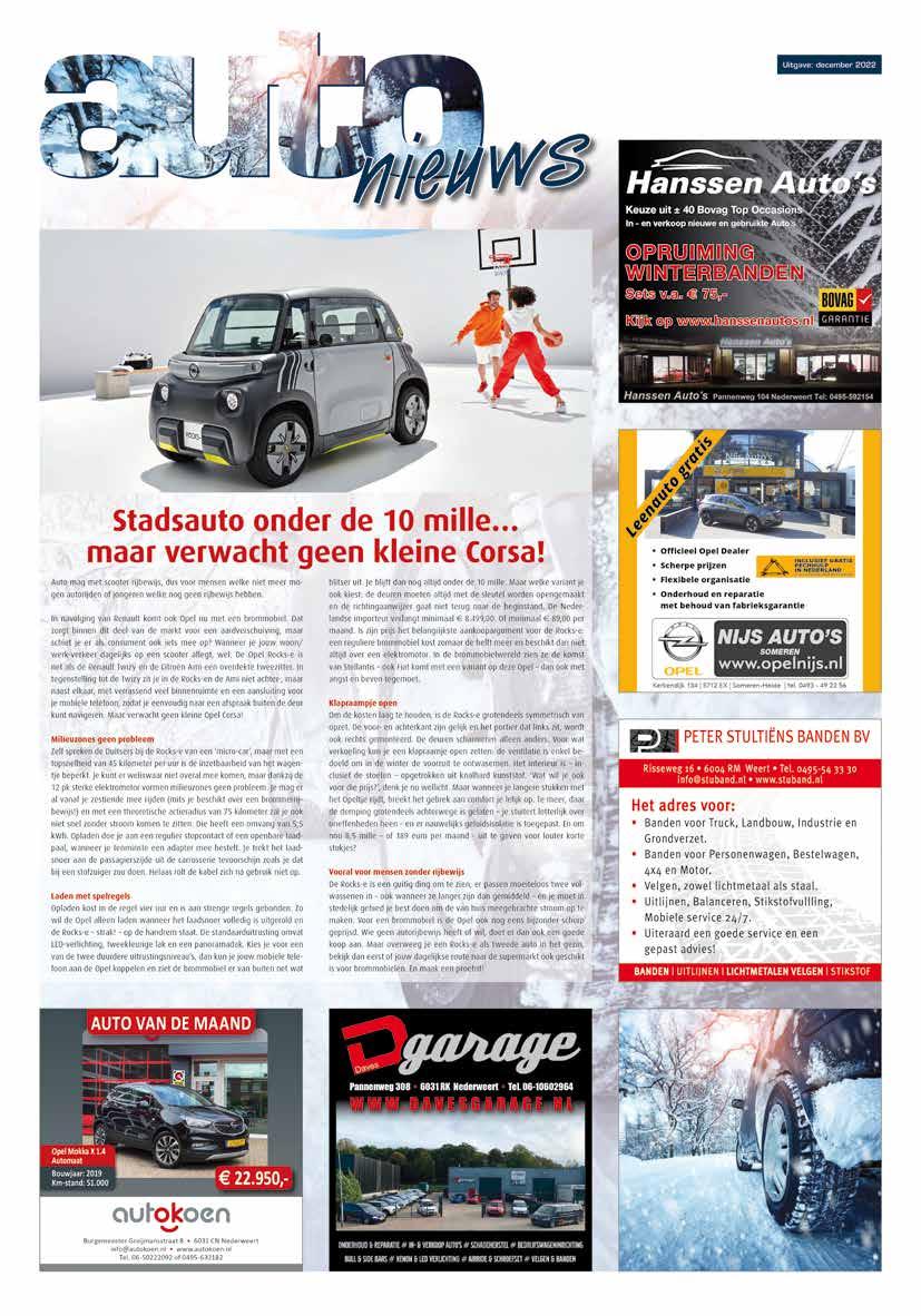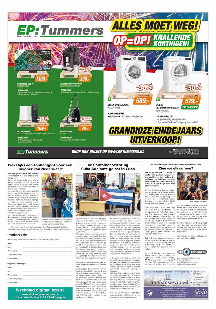 W E E K 5 2 • J A A R G A N G 9 6 • 2 9 D E C E M B E R 2 0 2 2 PANNENWEG 117 NEDERWEERT T (0495) 631 224 | WWW.KESSELS-INSTALLATIES.NL eert Ringselvenweg 2, 6002 SW Weert www.crematoriumweerterland.nl 0495 54 52 08 0495 53 33 22 24 uur per dag bereikbaar ww eert Redactie-adres: Pannenweg 231 Postbus 2724 6030 AA Nederweert tel. (0495) 63 26 25 info@drukkerijvandeursen.nl www.drukkerijvandeursen.nl w w w facebook.com / drukkerijvandeursen Hoofdredacteur: Huib van Deursen Afhaaladressen: cldgroep, Leveroy Phicoop, Ospel Albert Heijn, Nederweert Jumbo, Nederweert Bruna Gommans, Nederweert Gemeentehuis, Nederweert Drukkerij van Deursen, Nederweert Weekblad digitaal lezen? www.drukkerijvandeursen.nl of via onze Facebook & LinkedIn pagina • Dag en nacht bereikbaar • Persoonlijke begeleiding • Meer dan 30 jaar ervaring Groenewoudlaan 4, 6004 VE Weert Patersveld 19, 6001 SN Weert Tel 0495 - 54 38 15 - Fax 0495 - 54 61 84 E-mail info@uitvaart-vangansewinkel.nl www.uitvaart-vangansewinkel.nl Voor een uit vaar t of crematie in uw eigen s tijl g j (0495) 625714 Uw witgoed apparaat stuk? Expert Nederweert repareert! Mildershoof Anton en Dorianne Wijen Banendijk 4 • 6034 SV Nederweert-Eind Tel. 06-15 62 09 06 / 06-83 24 83 89 • www.mildershoof.nl Hieërlik Limburgs Ambacht Wij bereiden onze kazen in onze eigen kaasmakerij. Bekijk onze website voor meer informatie. SIKKENS VOOR EEN PROFESSIONEEL RESULTAAT NU 30% KORTING Op Sikkens muurverf en lakken bij uw verfspeciaalzaak r aamdecor at e schuifka sten v loeren deuren beveilig ng meng ver f ZONWERING SCREENS ROLLU KEN HORREN Kerkstraat 16 Nederweert • 0495 62 63 09 • www.huboduijts.nl • info@huboduijts.nl Senioren Menu voor € 16,50 Bij Gasterij de Brabander Sluis 13, 0495-663 466 wel reserveren De Tref nieuwe