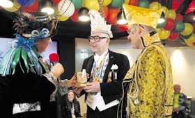 Burgemeester Op de Laak overhandigt de Kolderpin-standaard aan Marc Beelen. Foto: Nederweert24