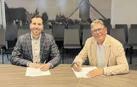 De heer Wim Schilders (rechts), voorzitter van het Parkmanagement Bedrijvenpark Pannenweg II, en de heer Jorik Franssen, wethouder Economie van de gemeente Nederweert, ondertekenen de samenwerkingsovereenkomst.