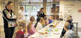 leerlingen, hun leerkracht en een hulpmoeder op de fiets bij het gemeentehuis. Na hun ontvangst door de burgemeester zocht ieder een plek aan de ontbijttafels. Hélène van Bakkerij Broekmans zorgde voor heerlijk vers brood en mengt zich onder de leerlingen. Ze licht hen toe waar een goed ontbijt uit kan bestaan en hoe voedzaam volkorenbrood is.