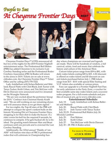 July 19: Lady Antebellum with Kelsea Ballerini and Midland July 20: Rascal Flatts with Clint Black July 21: Josh Turner with Tanya Tucker July 22-23: Professional Bull Riders July 24: Miranda Lambert July 25: Post Malone July 26: Keith Urban July 27: Tim McGraw with Devin Dawson July 20 – 28: PRCA Rodeo action For more in Wyoming