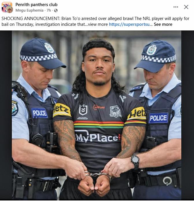 to social media to clarify Royce was still alive and kicking. Truth is it’s just one of dozens of fake posts that do the rounds on Facebook, which seems to have little control of spam and fake news on its platform. The latest involved winger Brian To’o – apparently he was arrested and at risk of missing last week’s game against the Eels. It’s all just farcical.