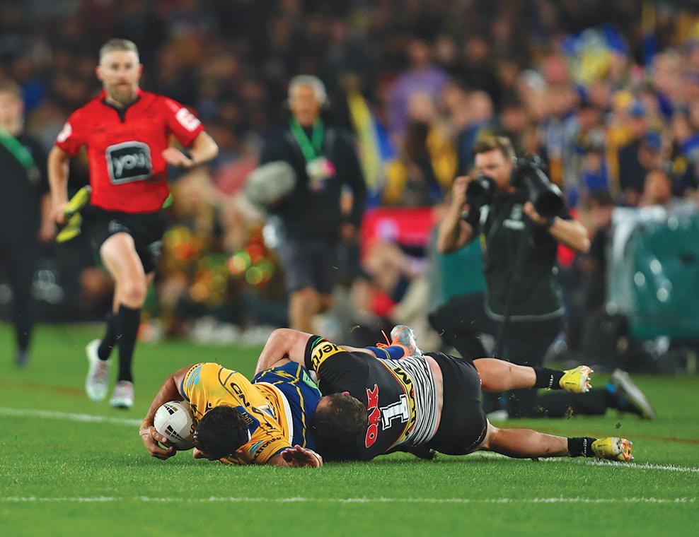 Having dominated the opening stages, Penrith are desperate to get on the board. The chance comes in the 11th minute when Stephen Crichton scores yet another Grand Final try – beginning a strong point-scoring period of the game for Penrith. After some good lead-up work from Isaah Yeo and Nathan Cleary, eventual Clive Churchill Medal winner Dylan Edwards gets the ball 30 metres out. He starts moving to the right, spots Crichton on his left and slips him the ball. Critter slides straight through the Eels’ defence and goes on a 25 metre run to open the scoring, leaving Clint Gutherson in his wake.