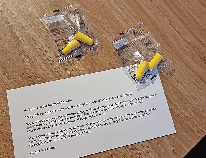 ! Noisy night: The staff at the Mercure Hotel at Panthers certainly don’t miss a beat. They left free ear plugs in every room on Grand Final night (pictured above), getting ahead of potential complaints due to noise in the precinct from the Grand Final celebrations.