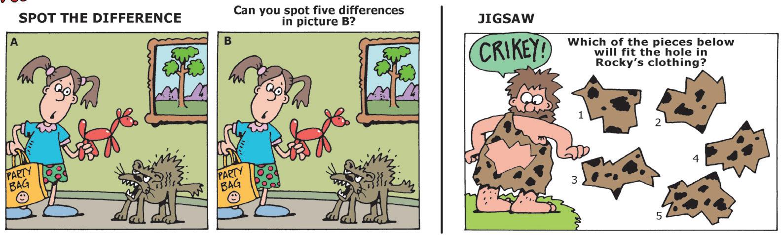 PUZZLE PLAY: SPOT THE DIFFERENCE: 1. One of the girl’s hair ties is missing. 2. The girl’s dress is longer. 3. One of the ears on the balloon dog is at a different angle. 4. The cats tail is upside down. 5. A branch on the tree in the picture is lower.