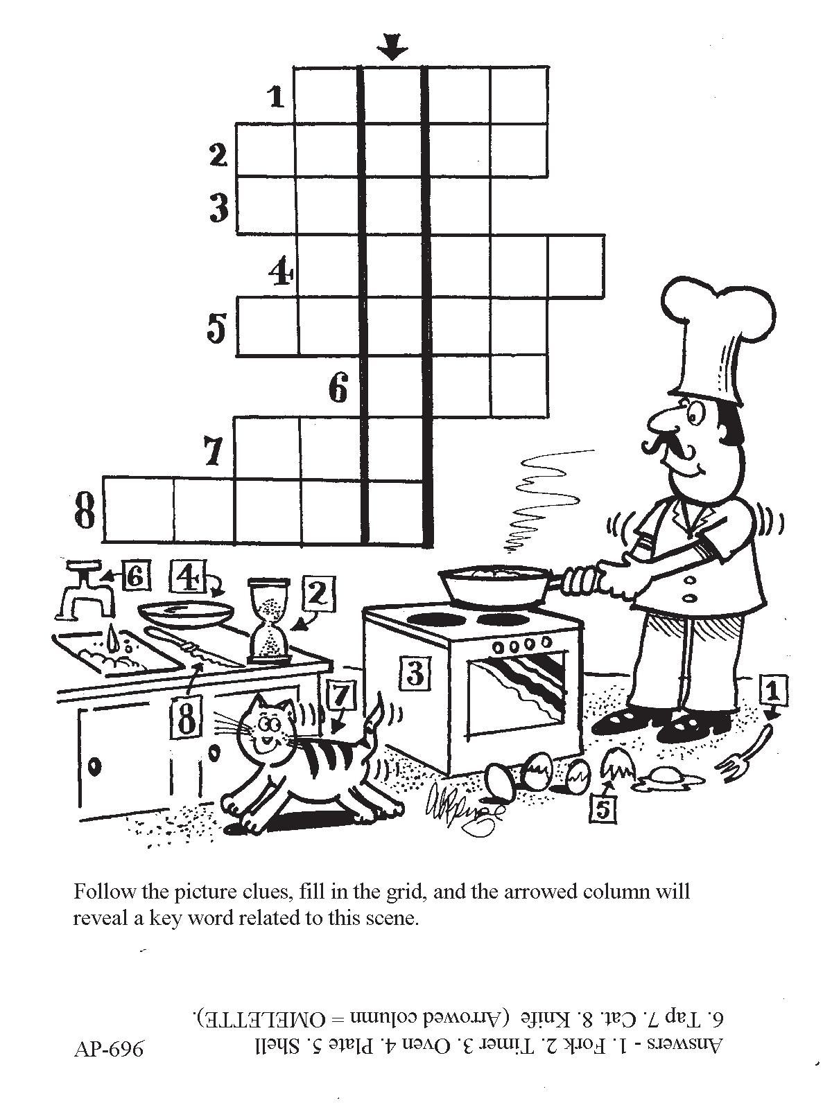 Special word: Con means a confidence trick. ACROSTIC PUZZLE: 1. fork, 2. timer, 3. oven, 4. plate, 5. shell, 6. tap, 7. cat, 8. knife.