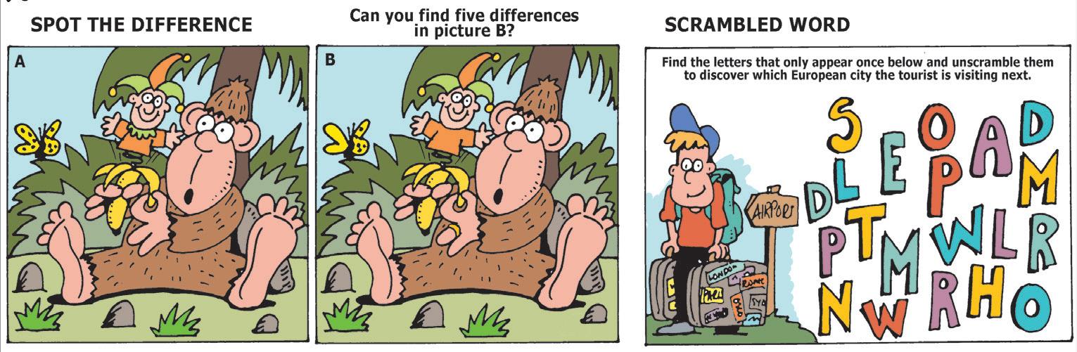 DIFFERENCE: 1. The butterfly has no spots on one wing. 2. The Jack in a Box has no frilly collar. 3. The monkey is wearing a ring. 4. One rock is in a different place. 5. The bush in the background has rounded leaves. SCRAMBLED WORD: Athens. WORD JUMBLE: Panda, bear, herbivore, jungle, animal and furry. WORD TRAIL: “Beware of potholes.”