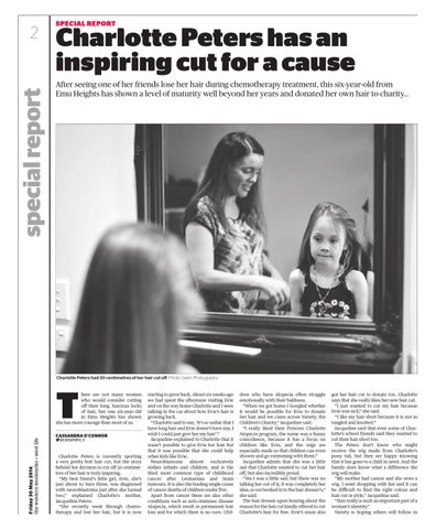 dren who have Alopecia often struggle emotionally with their baldness. “When we got home I Googled whether it would be possible for Evie to donate her hair and we came across Variety, the Children’s Charity,” Jacqueline said. “I really liked their Princess Charlotte Alopecia program, the name was a funny coincidence, because it has a focus on children like Evie, and the wigs are especially made so that children can even shower and go swimming with them.” Jacqueline admits that she was a little sad that Charlotte wanted to cut her hair off, but also incredibly proud. “Yes I was a little sad, but there was no talking her out of it, it was completely her idea, so we booked in to the hair dresser’s,” she said. The hair dresser upon hearing about the reason for the hair cut kindly offered to cut Charlotte’s hair for free. Evie’s mum also