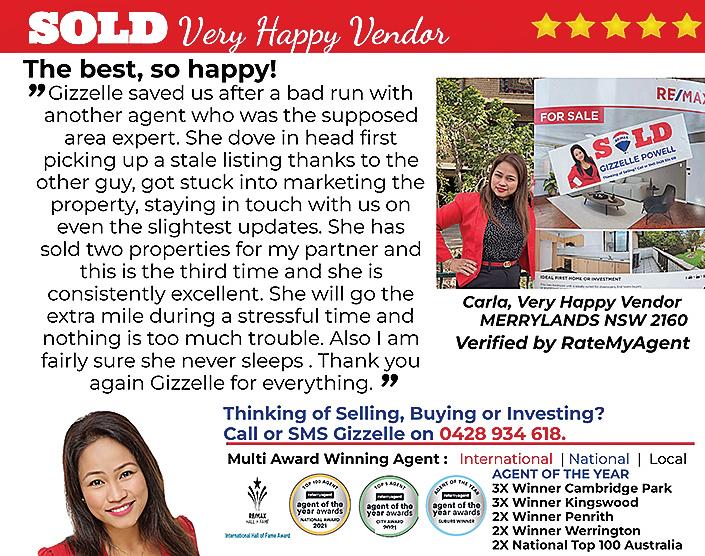 Western Property Magazine www.facebook.com/westernpropertymag 10 NOBODY IN THE WORLD SELLS MORE REAL ESTATE THAN RE/MAX.® Put Our Winning Team to Work Phil Haley 0412 355 020 Gizzelle Powell 0428 934 618 Paul Tanner 0410 587 553 Victor Borg 0439 755 081 Litsa Meleti 0466 969 164 Peter Parker 0408 432 998 GIZZELLE POWELL M: 0428 934 618 E: gizzellepowell@remax.com.au Potential Rental Return: • 4 bedder - $420 to $430 per week • 1 bedder - $310 to $330 per week Total Potential Rental Return: $730 to $760 per week Huge Block In A Great Location Price: Expressions of Interest Open Home: Call Gizzelle Potential combined rent: $1,100 Includes: 40mm waterfall kitchen stone benches to both, 2.6m ceilings Ducted aircon to main house $162,000 Gross Rent approx. All with ensuites High Support Living Turnkey Package IDEAL INVESTMENT (GOOD FOR SMSF) IDEAL INVESTMENT (GOOD FOR SMSF) 5 3 2 Sale : Contact Agent Inspection: By Appointment LITSA MELETI Want to know more? Call me on 0466 969 164 Your Investment Specialist 7 Dolphin Close, Claremont Meadows House & Granny Newcastle area NDIS Registered Land 3 2 1 + DUAL KEY Hot Property $670K Registered Land GIZZELLE POWELL M: 0428 934 618 E: gizzellepowell@remax.com.au Happy Vendors LITSA MELETI Want to know more? Call me on 0466 969 164 Your Investment Specialist 4+1 2+1 1+1 – Verified by RateMyAgent Thinking of Selling or Investing? Please give me a call or SMS Litsa on 0466 969 164 From our