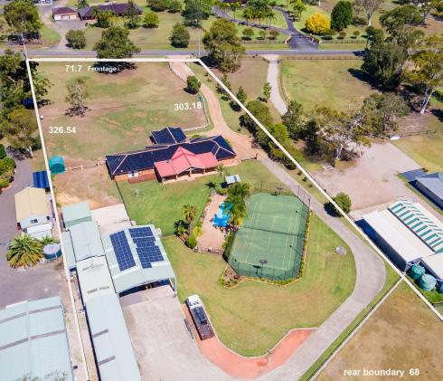 The outdoors is the real show-stopper here with an outdoor entertainment area featuring down lights, fans, access to the garage with toilet and shower, overlooking your inground salt water pool, tennis and combined basketball court, 2.14 hectares of cleared, NOT Flood affected fully fenced land, multiple commercial sized sheds that can hold farming equipment with 3 phase power, separate alarms to the main house, the driveway runs all the way through to the sheds at the rear of the property which is suited to hold truck weight, an 8-car under cover parking space, double remote garage, 3 stables, 6 separate paddocks with water and shelter access. A large dam and bore water irrigation through the entire property, town water, a large solar power system and enviro cycle tank and so much more…