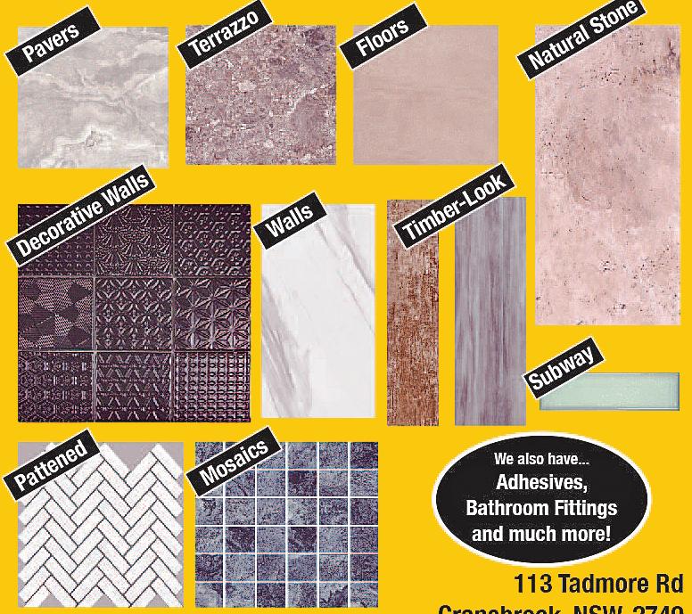 Western Property Magazine 31 www.facebook.com/westernpropertymag WW50205 50205 113 Tadmore Rd Cranebrook 4777 4214 info@herrmanntiles.com.au herrmanntiles.com.au Since 1964 We also have . . . Adhesives Bathroom Fittings and much more! VISIT OUR LOCAL MASSIVE SHOWROOM TODAY! Come and see our HUGE selection of new modern tiles on display as well as our limited HARD TO FIND styles to match existing decor. 50 YEARS! WE’VE BEEN HERE FOR OVER Pavers Patterned Walls Floors Subway Terrazzo Mosaics NaturalStone DecorativeWalls Timber-Look