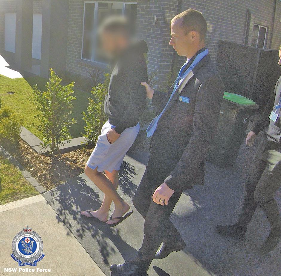 Video footage released by NSW Police shows detectives knocking on the front door before busting into the property. Carter was inside and was calmly walked out of the house to a waiting police vehicle.