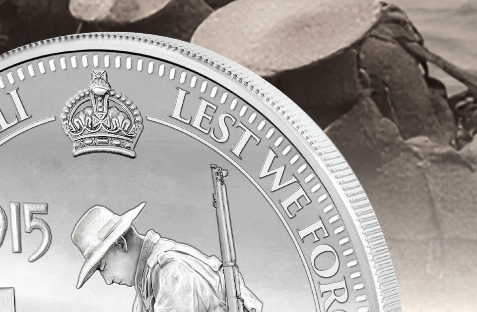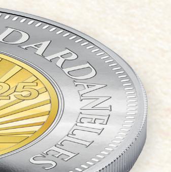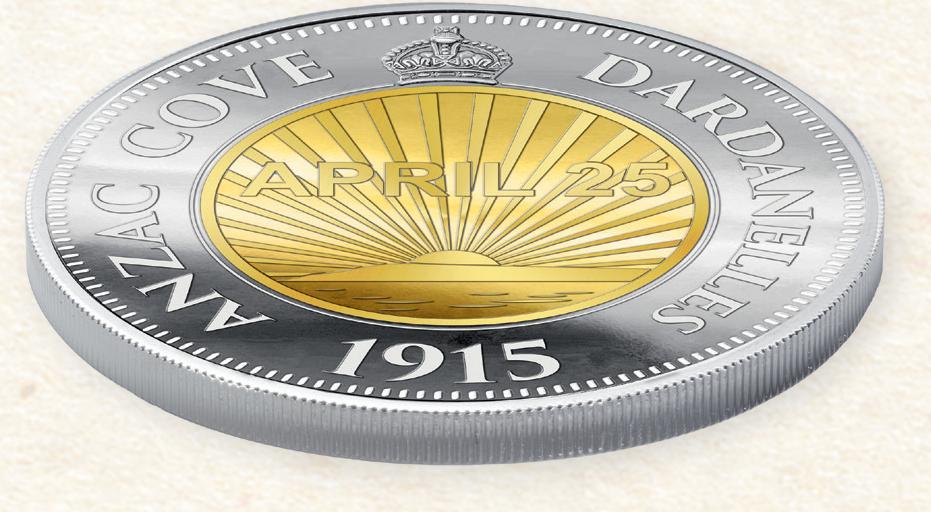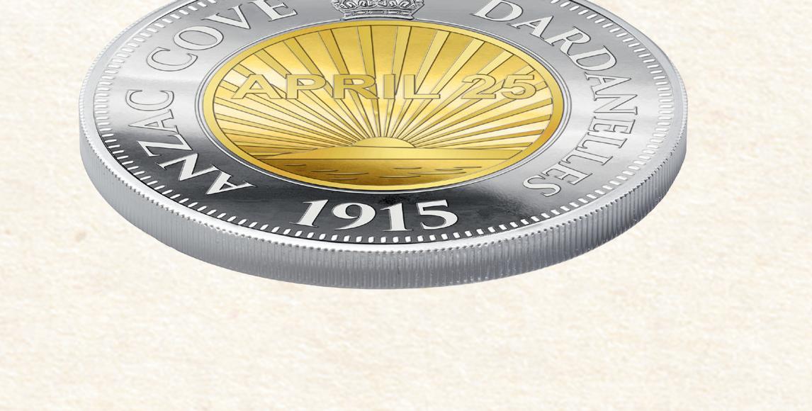 OBVERSE A 24-carat gold accented rising sun with the date 25 April and locations Anzac Cove and Dardanelles along with the year 1915.