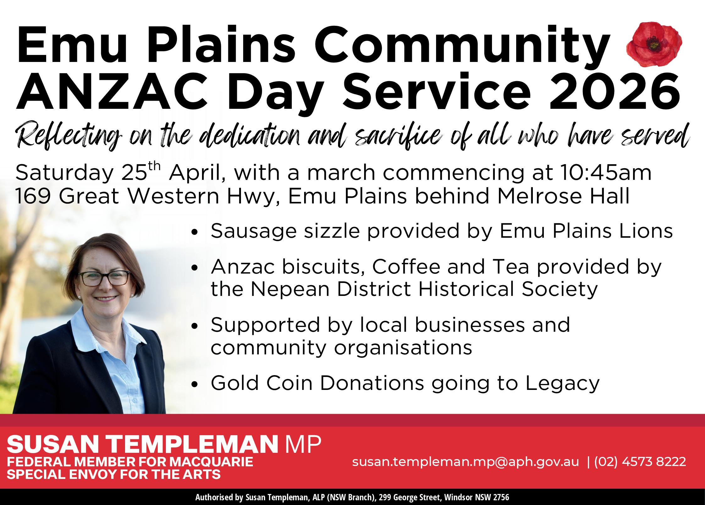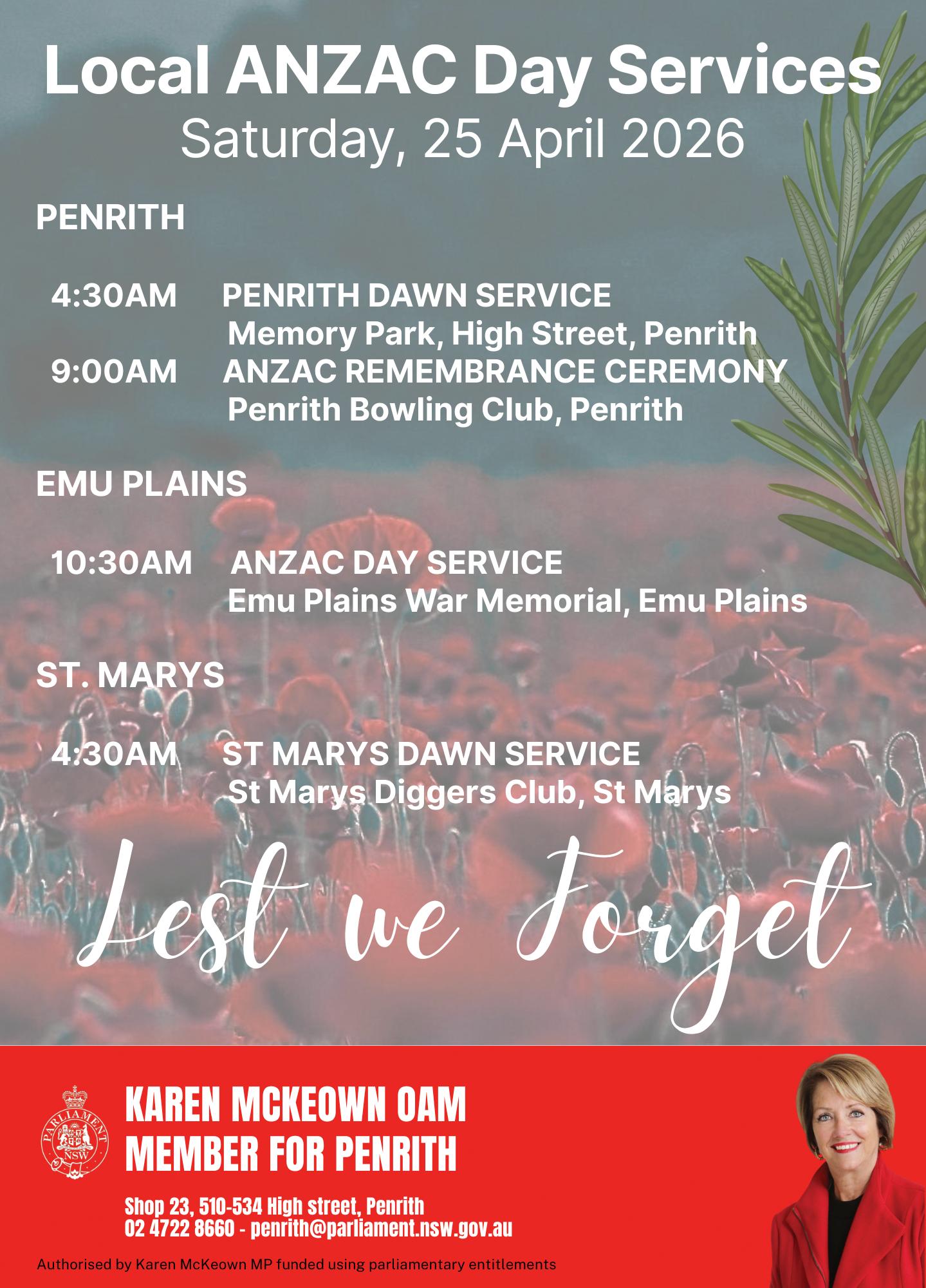 Following the service, Penrith RSL Club will provide breakfast, and any gold coin donations will go towards supporting Legacy.
