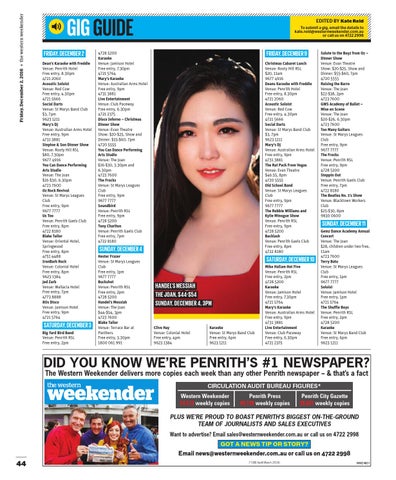 FRIDAY, DECEMBER 2 Dean’s Karaoke with Freddie Venue: Penrith Hotel Free entry, 8.30pm 4721 2060 Acoustic Soloist Venue: Red Cow Free entry, 4.30pm 4721 5666 Social Darts Venue: St Marys Band Club $3, 7pm 9623 1211 Mary’s DJ Venue: Australian Arms Hotel Free entry, 9pm 4731 3881 Steptoe & Son Dinner Show Venue: Rooty Hill RSL $80, 7.30pm 9677 4916 You Can Dance Performing Arts Studio Venue: The Joan $16-$30, 6.30pm 4723 7600 Oz Rock Revival Venue: St Marys Leagues Club Free entry, 9pm 9677 7777 Us Too Venue: Penrith Gaels Club Free entry, 8pm 4722 8180 Blake Tailor Venue: Oriental Hotel, Springwood Free entry, 8pm 4751 4488 IronBark Rock Venue: Colonial Hotel Free entry, 8pm 9623 1384 Jed Zarb Venue: Wallacia Hotel Free entry, 7pm 4773 8888 80s Disco Venue: Jamison Hotel Free entry, 9pm 4721 5764