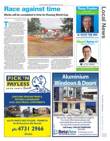 here’s only weeks before the Rowing World Cup comes to Penrith's Sydney International Regatta Centre (SIRC) and the fi nal works are still being completed to ensure the facility is in top condition. On June 12, 2012, the State Government promised as part of its annual Budget to fund upgrades to the Regatta Centre, which was constructed for the Sydney 2000 Olympics. Initially estimated to be completed by January 2013, most of the extensive upgrades have been completed with the exception of two projects that are expected to be fi nished by the end of February. The scope of upgrades for the Regatta Centre include a complete renovation of the athletes’ changerooms, purchase of an additional pontoon for the warmup lake, construction of a commentary platform at the Eastern Bridge, new portable boast racks, replacement of the regatta’s clocks with new LED displays, trailer parking space and water quality improvement works. There will also be a catering and utility storage building and a shelter behind the Lakeside Restaurant. “The total value of the upgrade package is $749,000,” said venue manager of the Regatta Centre, Kevin Flynn. “All projects have been completed except for the shelter and the storage facility – both of which are situated behind the Pavilion. Both projects will