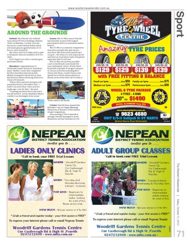 AROUND THE GROUNDS Softball: The Penrith City Softball Association (PCSA) is holding a Battery Clinic on Monday, October 14 at the Surveyors Creek Softball Fields which will teach players aged between 10-15 how to catch and pitch. The clinic starts at 6.30pm and is open to all players that are members of PCSA clubs. Don’t forget your mitts, catchers gear and water bottles. Marathon: Congratulations to Weekender reader and local ‘marathon mum’ Shelley Cootes who completed her fi rst marathon late last month. Shelley managed to fi nish the 42.2km Blackmores Sydney Running Festival in 5 hours 39 minutes. “When I fi rst started training for the marathon back in December 2012, I hadn’t run more than 11km and two weeks ago, I ran 42.2km,” she said. “Training was hard, but in the end it was all worth it. I even remember when I couldn’t run the length of my street.”