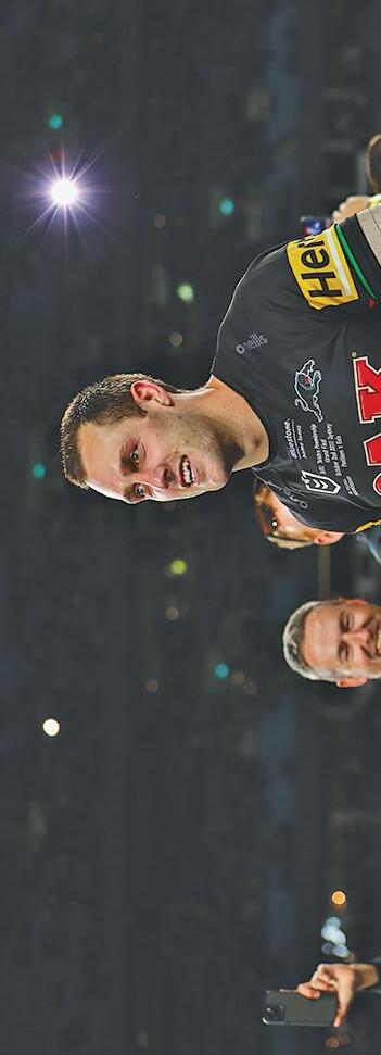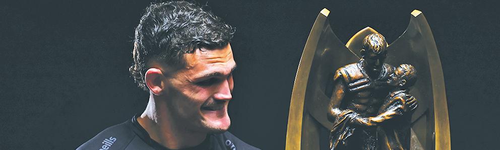 Panthers skipper Nathan Cleary protects the NRL trophy. Photo: NRL Images. with Peter Lang