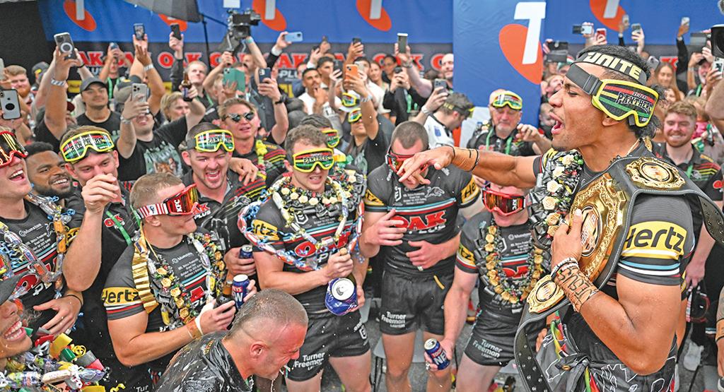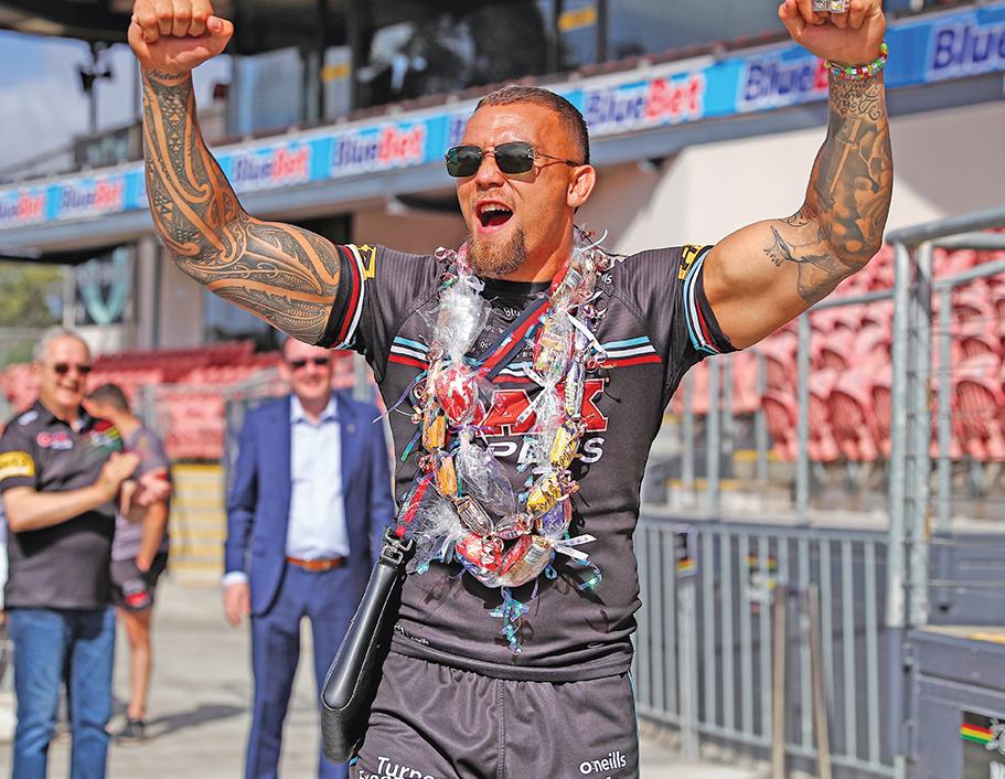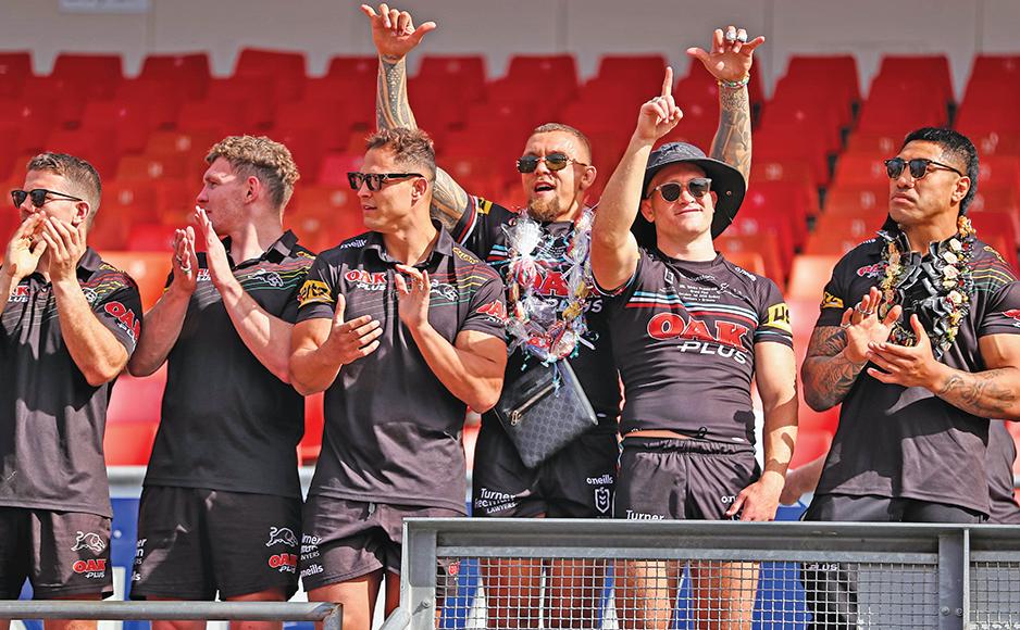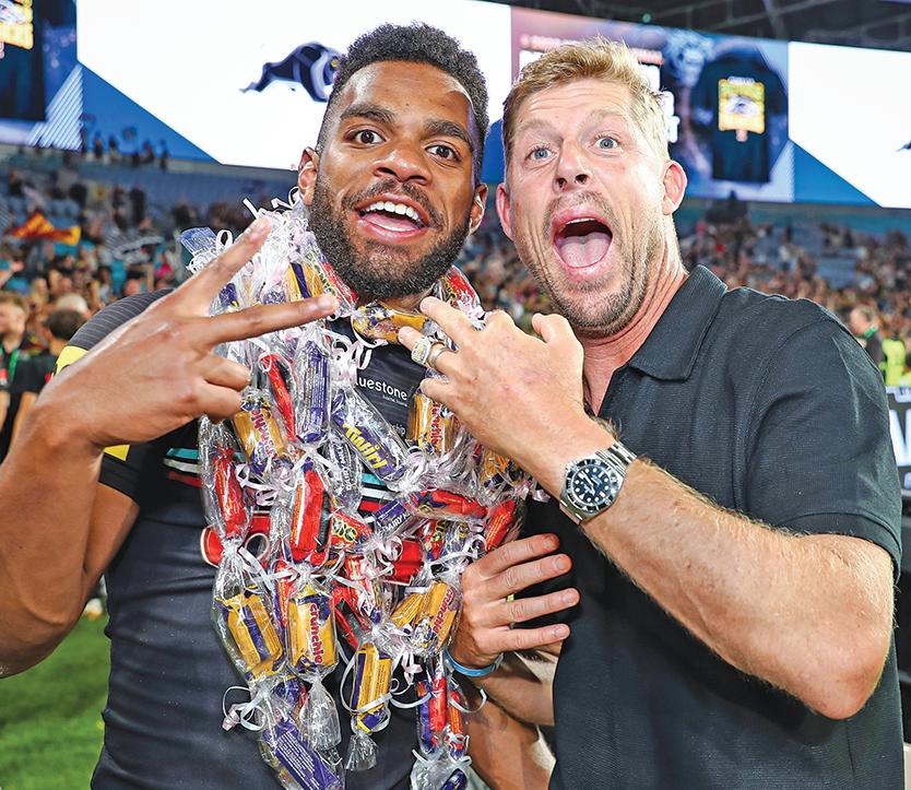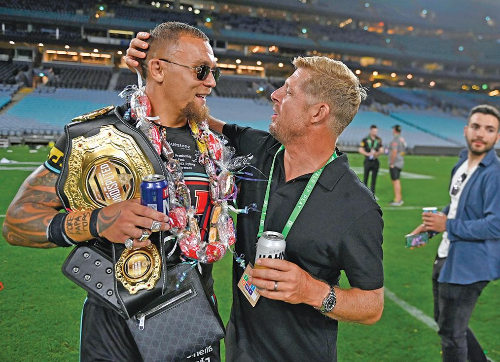 ! Fanning rides Panthers wave: Surfing champion Mick Fanning played a big role in Penrith’s post-match celebrations at Accor Stadium last weekend (pictured below with James-FisherHarris). Fanning, a life-long