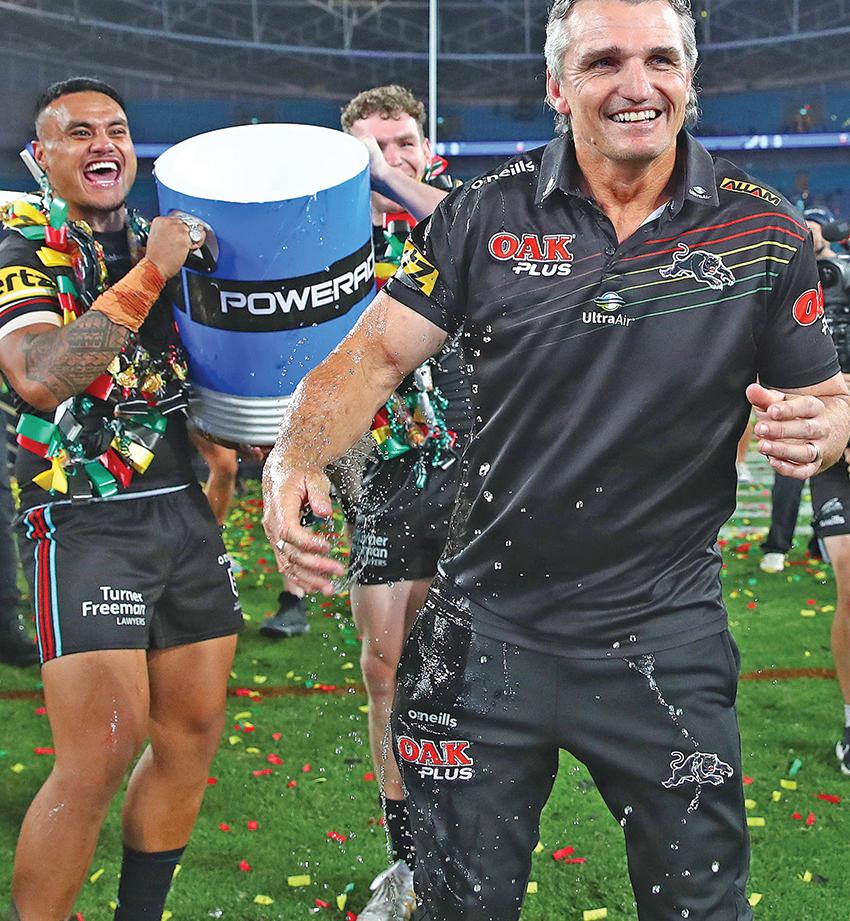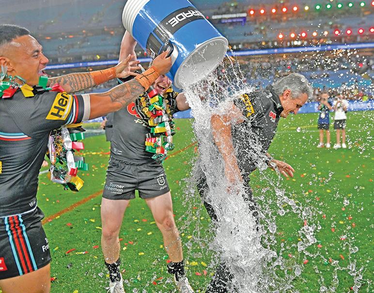 Ivan Cleary is soaked as the celebrations roll on. Photo: NRL Images.
