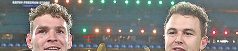 Liam Martin and Dylan Edwards with the trophy. Photo: NRL Images.