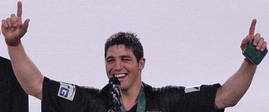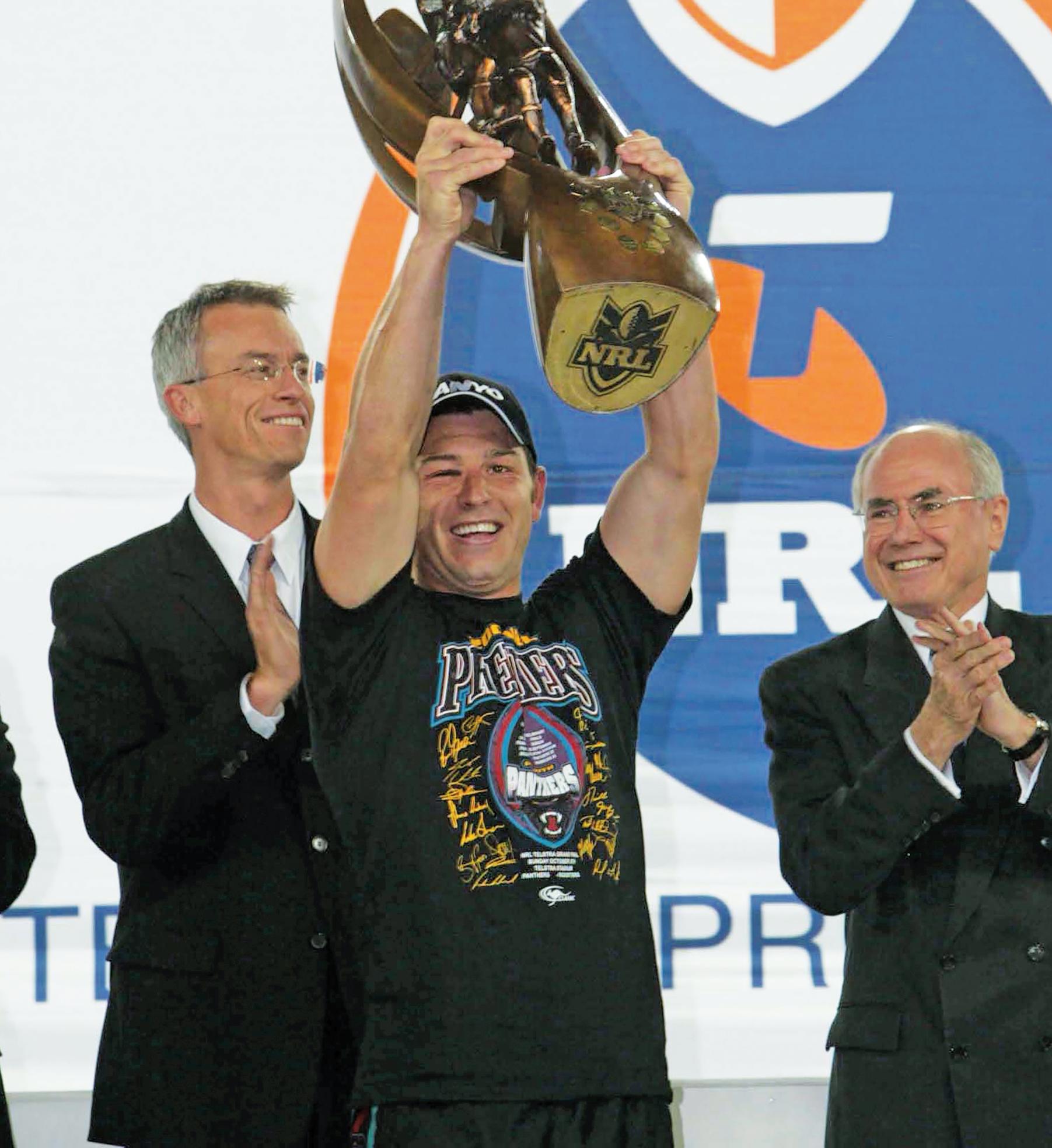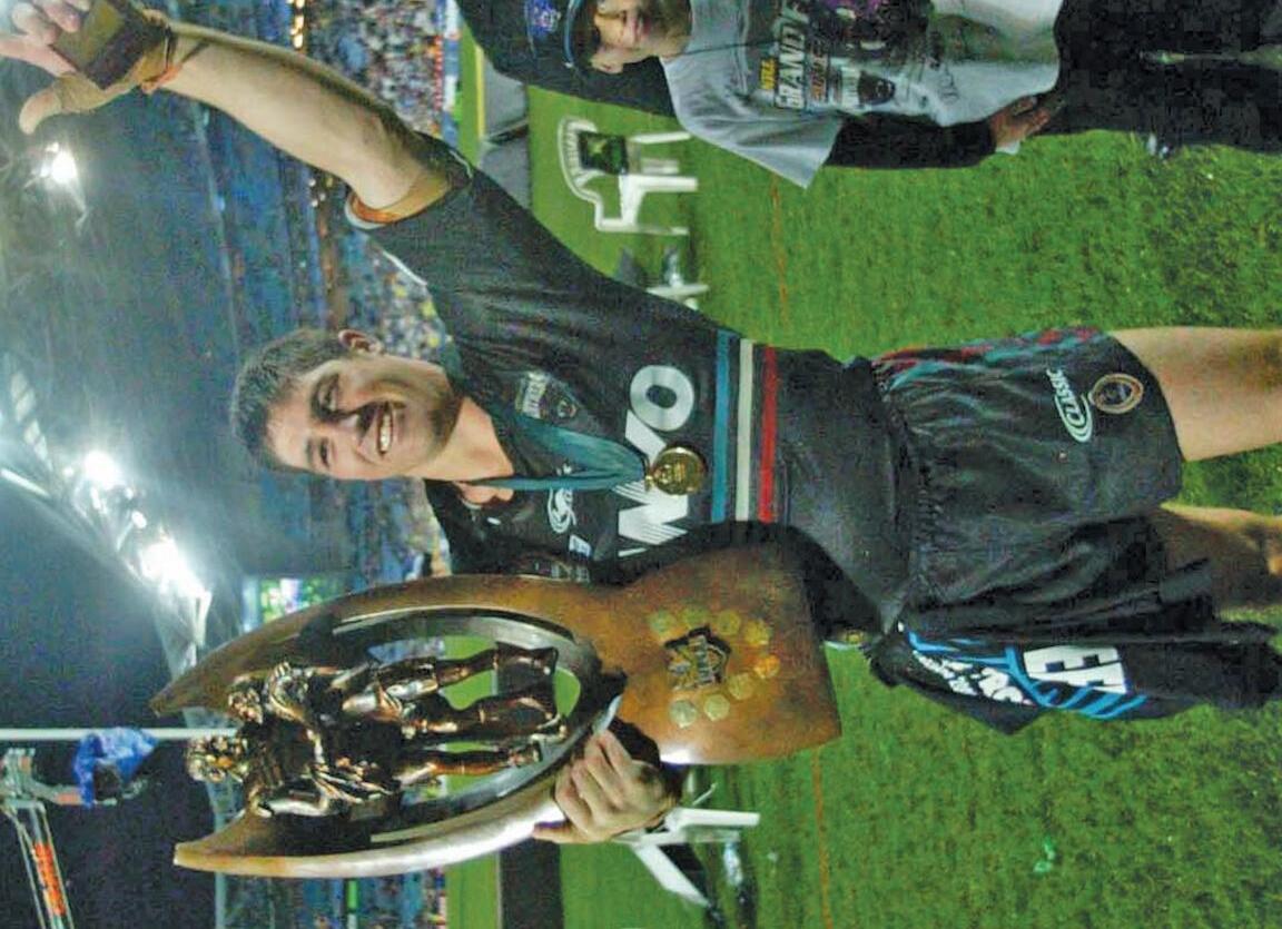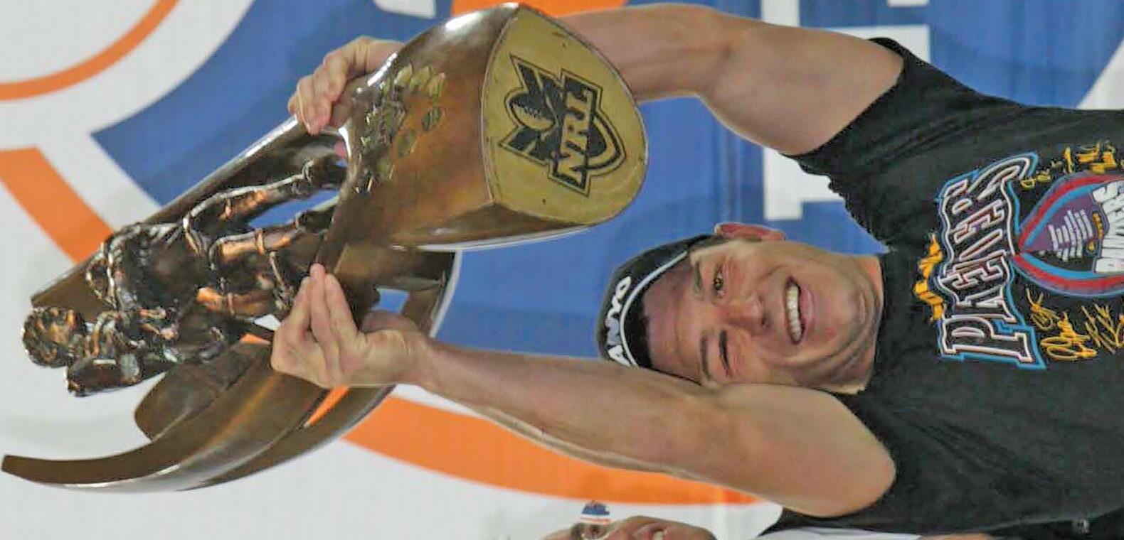 Craig Gower raises the trophy after the 2003 Grand Final triumph.