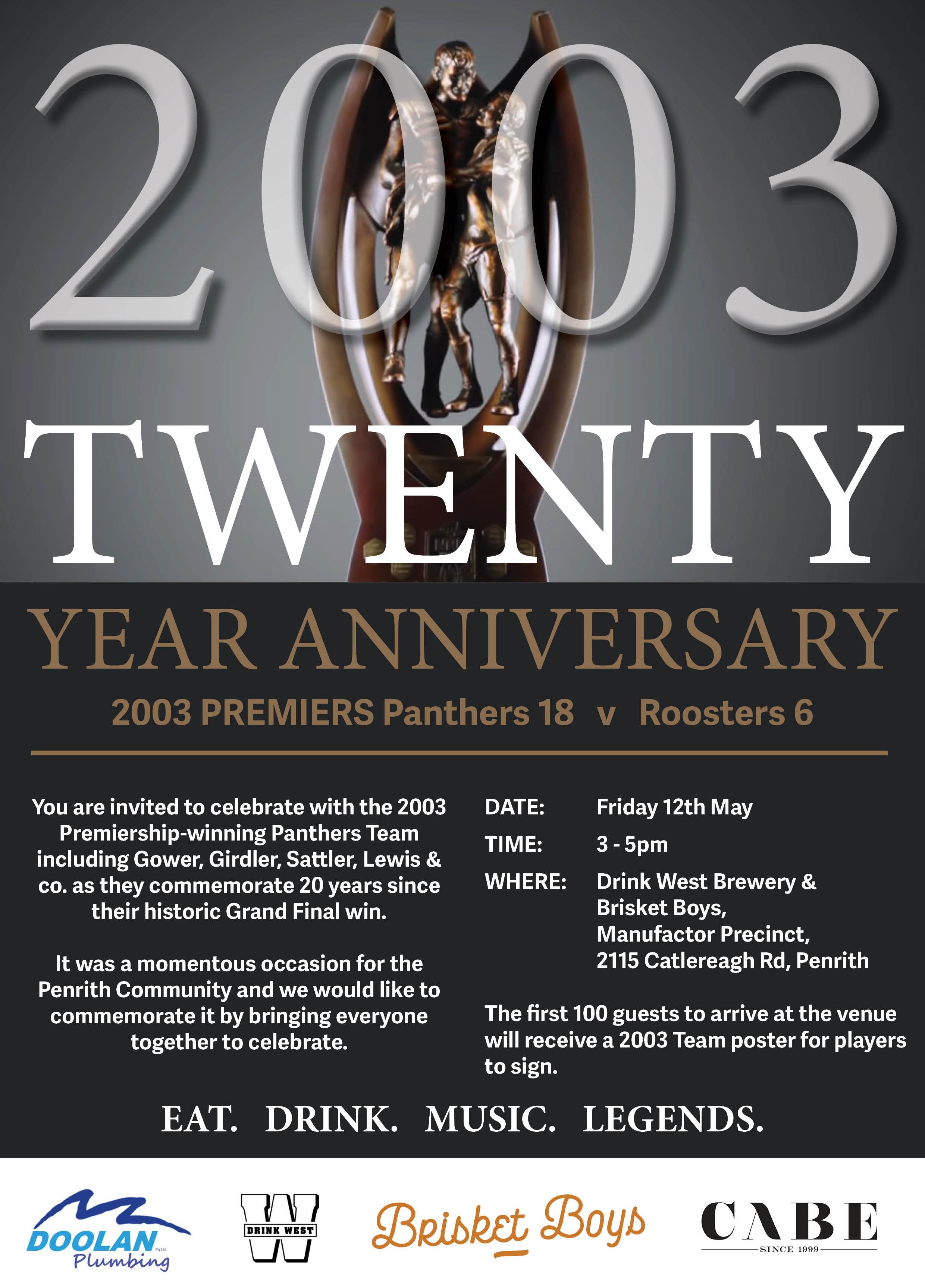 ! Directors help out: Members of Penrith’s Board have given up their spots in the Director’s Box at BlueBet Stadium on Friday night for members of the club’s 2003 Premiership-winning side. It’ll be a big day for the 2003 boys – they’ll kick off celebrations with an event at Drink West and Brisket Boys on Friday afternoon before making their way to BlueBet.
