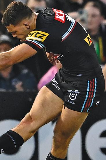 The Panthers celebrate a try against the Warriors. Nathan Cleary takes a kick.
