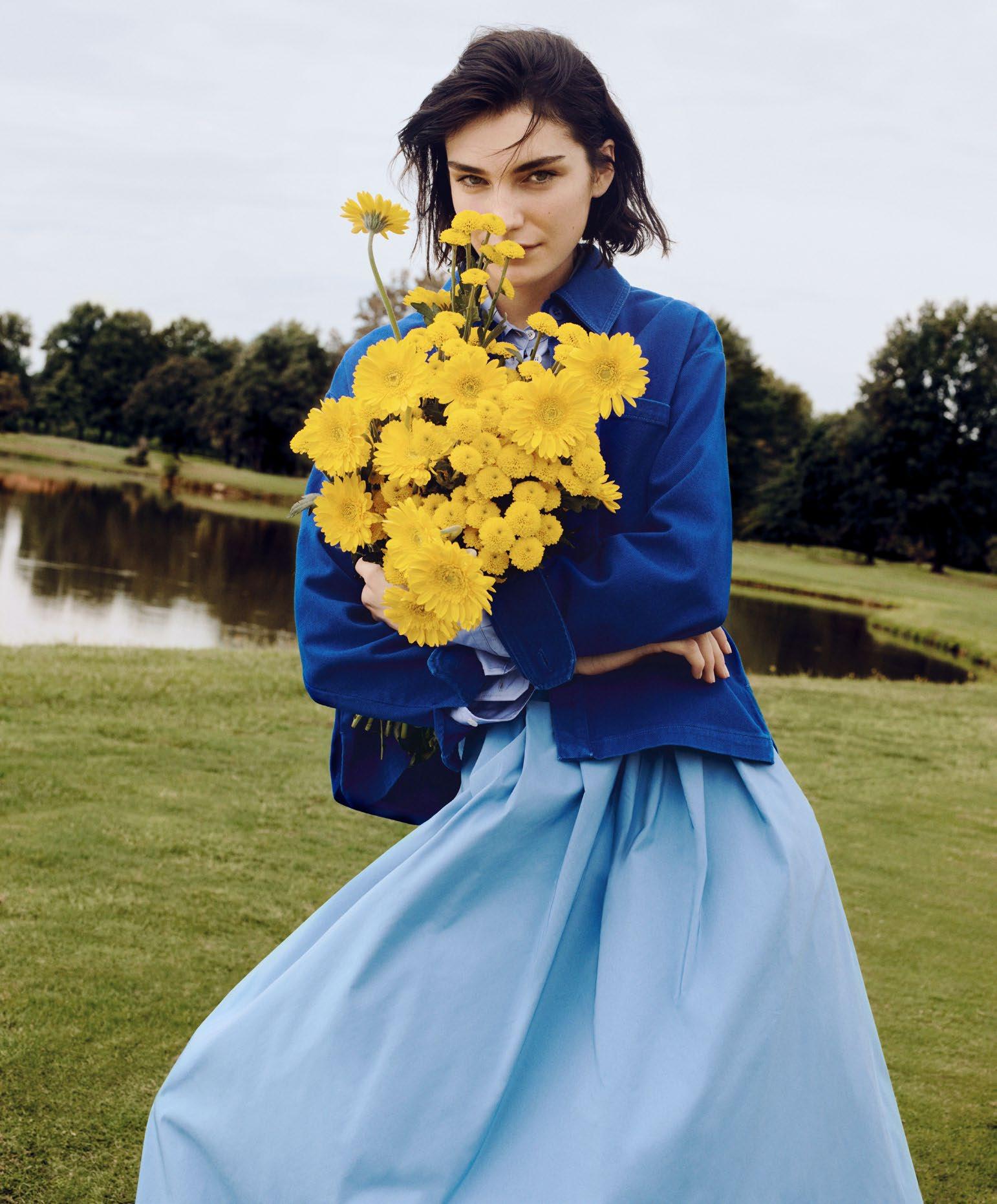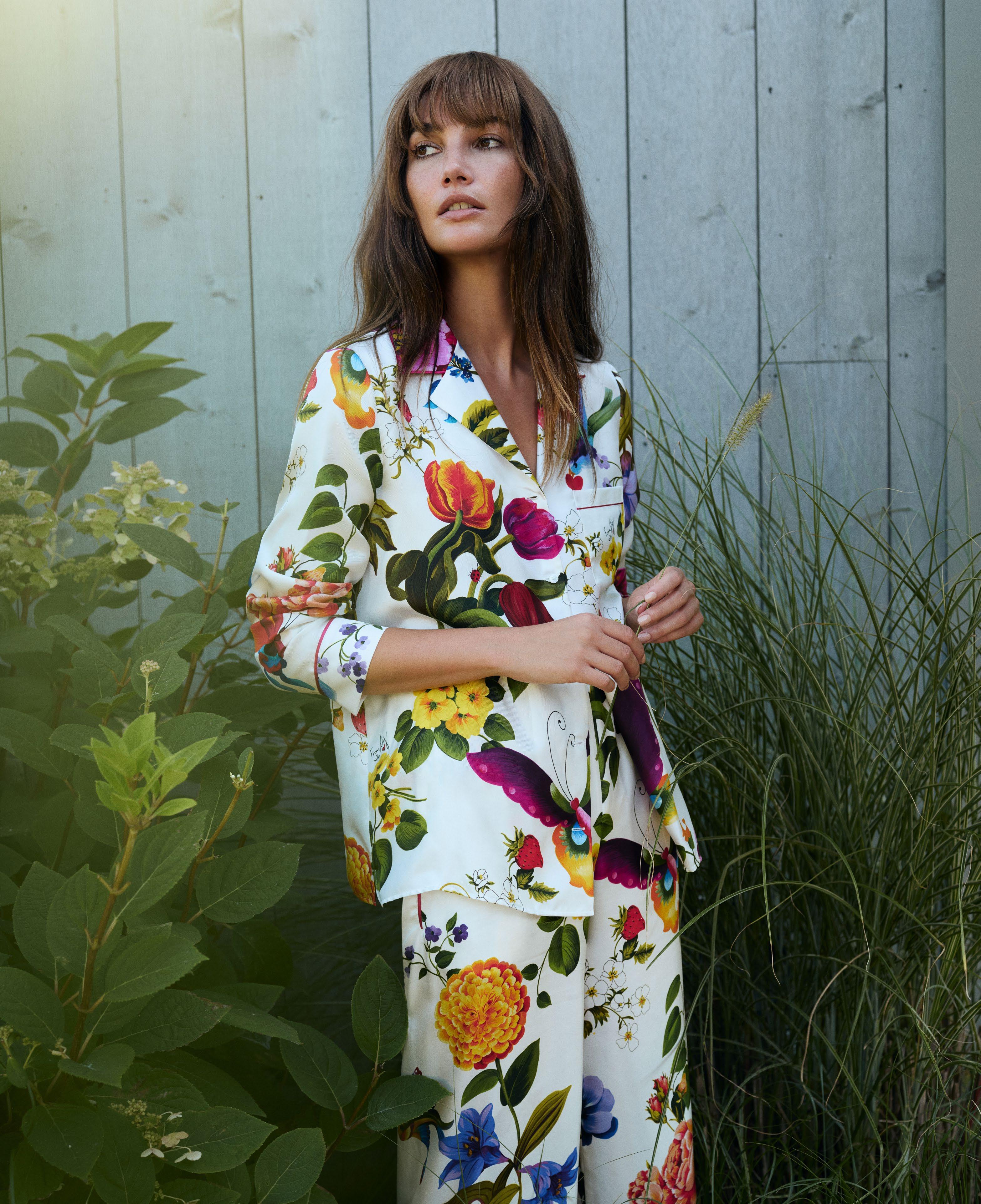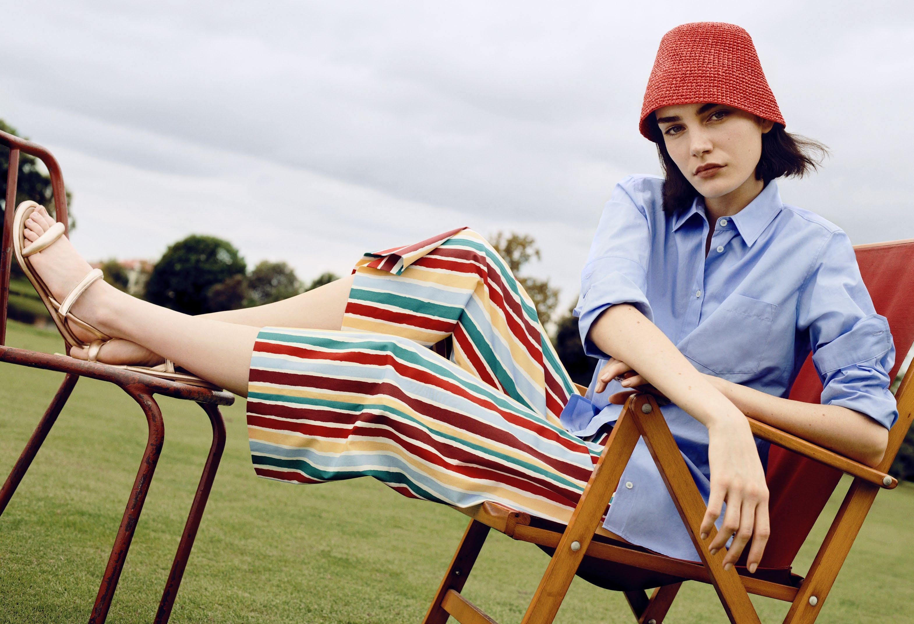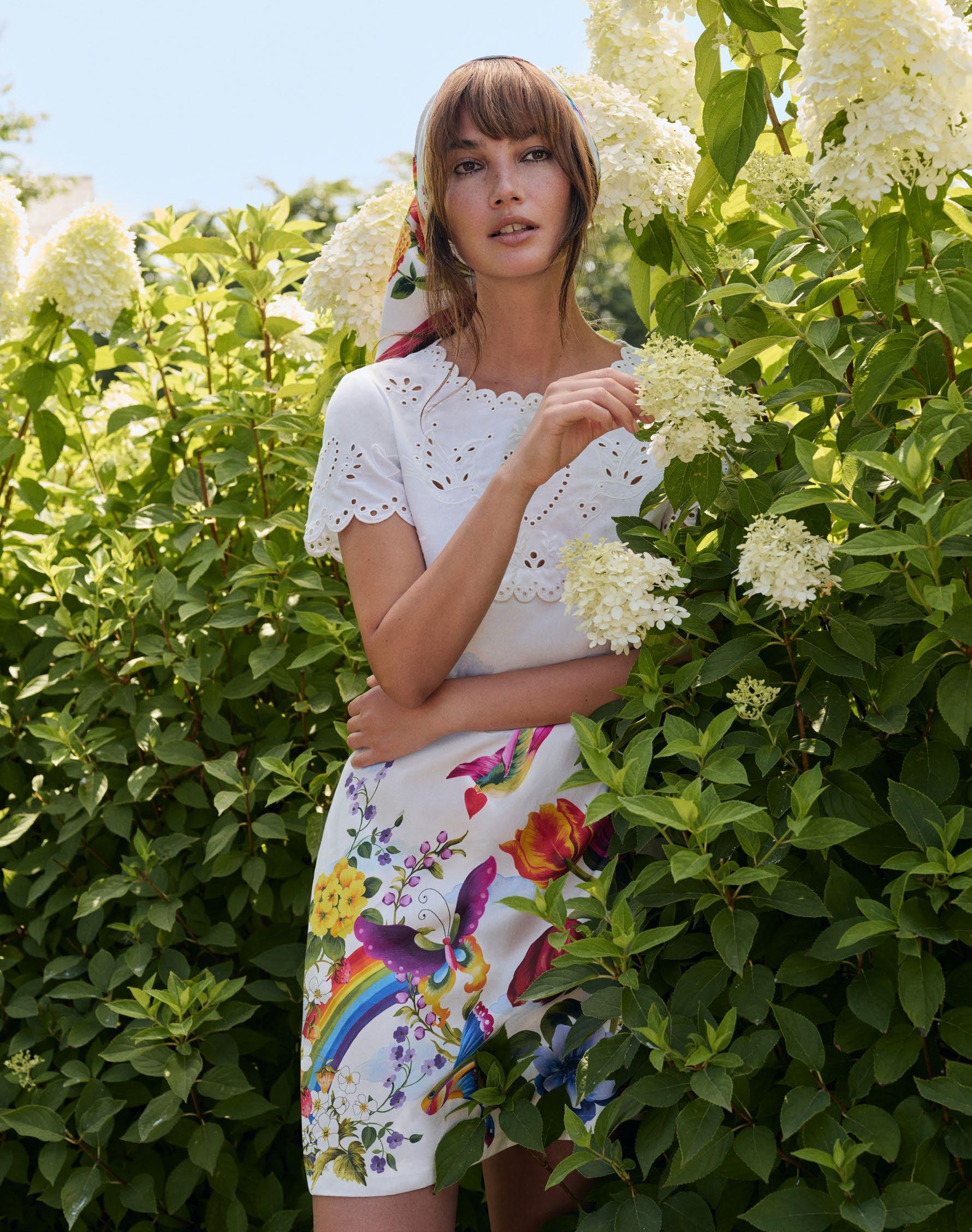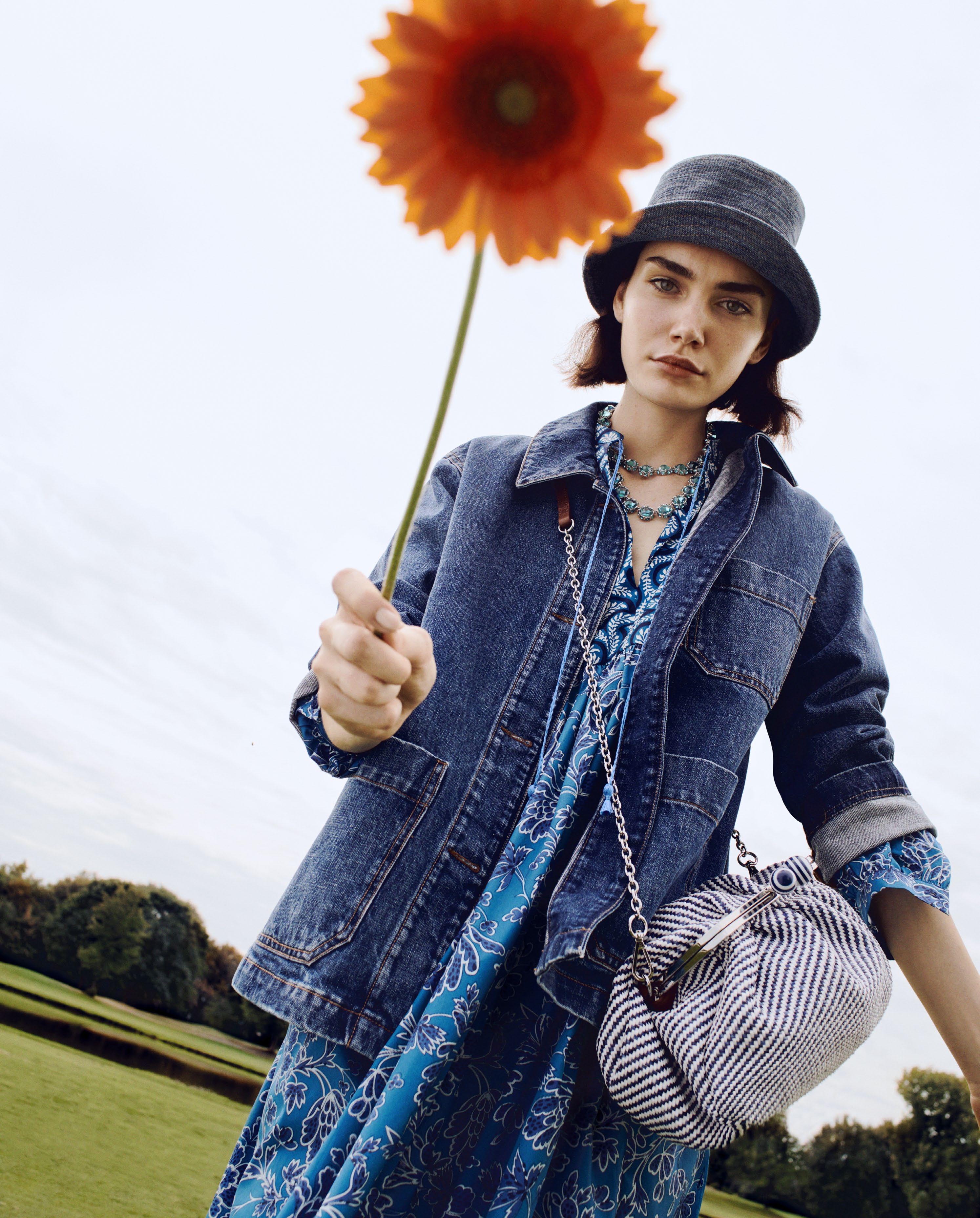 An overall light-hearted airiness flows through the capsule. The traditional crispness of linen tempers the formality of a vested pantsuit while the sporty aura of denim is elevated by exquisitely embroidered motifs reminiscent of the collection’s prints. Floaty and romantic, dresses are a favourite both in finely decorated eyelet cotton and in gauzy textures. A fluid pyjama set comprising of shirt and trousers in slinky silk twill embraces an East-meetsWest feel with a sunup-to-nightfall versatility. Accessories add the final touch: a dedicated interpretation of the iconic Pasticcino Bag, as well as a hat, silk scarves, and shoes. “This quite eclectic mix of pieces with a certain timelessness is a lot like me!” muses Aldridge.