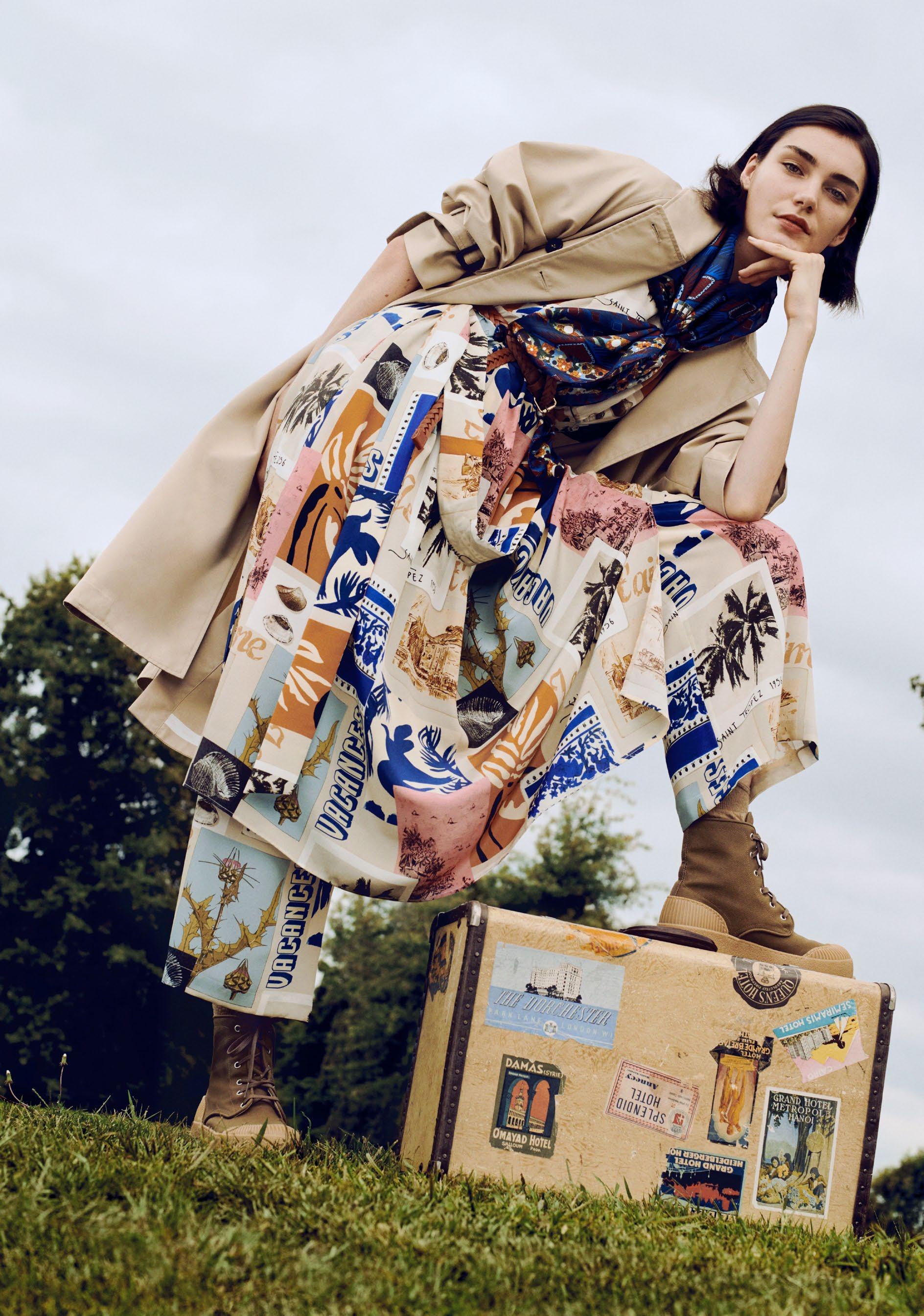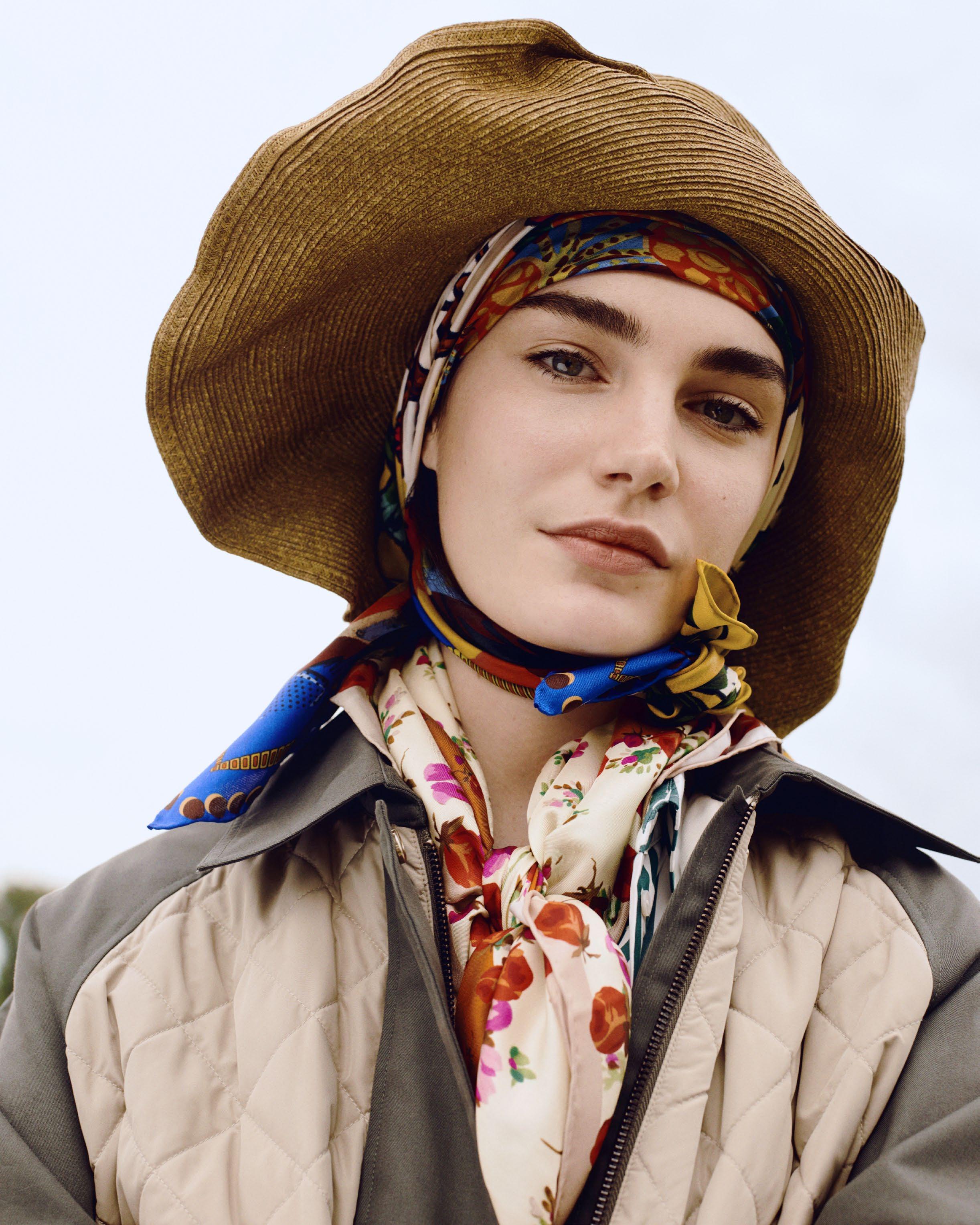 Florals playing. Pasticcino Bags, silk scarves and longuettes. From summer parties on the lawn to gardening goddesses. The new trench in olive blends into the setting. The floppy cloche completes the picture.