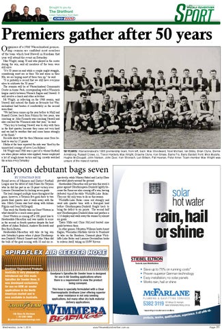 Tatyoon debutant bags seven BY JONATHAN BOX Round seven of Mininera and District Football League saw the debut of Josh Fraser for Tatyoon who he did his part in an 18-point victory over Lismore-Derrinallum by kicking seven goals. The lead changed multiple times throughout the game, however, a Tatyoon five-goal-three to two points final quarter saw it walk away with the win. Mitch Cronin was best along with Adrian Pilgrim and Sean McDougall. This week the Hawks take on Great Western in what should be a much easier game. Great Western is coming off a 180-point loss to Hawkesdale-Macarthur and was unable to score in the second or fourth quarters despite the best efforts of Adam Bullock, Andrew Beckwith and Ben Birch-Burton. Hawkesdale-Macarthur will take its big win into Saturday’s game when it plays Glenthompson-Dunkeld. Patrick Sinnott and Jake Main did the bulk of the goal scoring with 10 and six re-