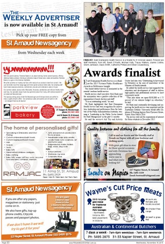com.au ed peop fabulous. Beltz ask fierceand t . a 8 e 8 n 7 li 7 ets on 0447 59 copg her on purchase by callin ould also c le p o e p rce ebsite. omor- makeFendyt 900 ugh all the stori She said d nch Fie have a c via the w o cess at H ’s secon will lau nt, they “Even th the book e of Suc re f is Beltz rc o fe o s s if F u d ie e lo t. hich re u h a b w ig a s n F r, u minin e y lo d a w u n t o P no on Saturd en from Aus- Fab Fierce a e ave the cisions . Café Jas mphs sh om wing I H n thread made de efit their and triu res 15 w ubai, sharing mo n have n ok, follo s e e o tu e b b a m g o n to fe e w o n k ll uthern a ls missio e h a oo so D h c t a T u d “ in e is b n a th p s, re in e u aland mselvla depicts cesses rowing ss trmaunnitsies. The r theld New Ze and suc just fo a girl g rand -c o their com W ulations ced as fa s ie . il a y rials, trib c m it c mun to.” urnal- fa ta, Rebe the com Africa. und in jo ver lot to relate omen Yeukai O ess and backgro feature in o w a c g s n is ra a d ti e h a m e o to Wim z, wh rron K omen e and Sha ed the w about th McIntyre interview did and y e th t a wh they did ating. were cre also the nge they It was ecourse. c a spitality o R h hristmas g ry e trainin Get your C e l prima errg a iv la in n a g u ri e e o it don usly qu e for th limited shopping coning centr - obvio but it will have the west st snap in the train m before en n a ju h o h c st r a it o rs s k o le y ie e rl H it t a ea facil sity in era Trad m erooms, g geroom im n l. in! a a a W h v c o rg f of the up a ba . SON ouncil s a struction o ern side N LAW l City C ed- short term d stage involve . A e ra u E tr n R rD e o C m Y in n H a F g B o p rse m Horsh uchers “The sec fit, and develo cated.Tradin ent at golf cou ding fro and gift vo r-di , the veItry shifted to the pea straw evelopm ege’s Dim- bought the buil y last year and rio exanpddlode bhouse ificant re orvthoatlv *Excludes ec s ise n lu e g c ’s pr wer it a si ll ry po o rs V e ra C ct t an in ive o 0 g mous tractions. se, the execut as a temp a tra y eration Univ t e90shif thmeier wnort kprelaqunirensin sham res. or as9 at’s0 nit workhor ommunit dFuelenddth le ie t rio has en ope rtccuab ay bushfi acehine th20 md t 900 Vaing y.oAn e ara rvg Road C momen- originally sche A faermeernthdato’sfseAriopusmriarablkeout, the Fegndfu s. dese k Saturd d cienc pBepim ue c n p la u e yo ildeffi B u us nt b r ca boola ou or th th e in e e seriou ct m f ft s. ra re th tra busin gather ns in ys you’r teesntion o to develop a l ity sold cur befo LeadiningCVthTe technologyfa, anrmderpathat“T a mea c il s rs o e li e t w o h d iv to l h n n a u e Ov best mer The for the s u are. will be last year. F twatoion. ring sum mes the this year. tech90n0icisusaeslabsentouseialt agrvriciculeture asyyofoin stae gineform les and fe e council the tum du serio co onto-da r mor gerooms for ma ing to th il e c c b Ag n ge and n u e it in s. o tio ll rt ie C o ac n a it e C k Mact Tr i-use d chan nd umpire facil about John Cont rsham lt o o days wh osebroo u ri r H e e R m p g t a t f n in if a o n. ma be Corporatio t.com.aaules me ave a jo www.fend m ide brand of AGCO tative’ sh as part oola rldw basically new ho rec- council h ed a ‘ten s Fendt is a wo e Dimb “It will g up to nt. os- firm school holiday cation in h ra d t for th u r il n a e u e b st m rm w e e e e which R fo n th lo ng re l, g e ri a re g a r u v th in d e fo O f tt th e o y g s t from ne of mmunit FINALIST: East Grampians Health Service is a finalist for A Victorian award. Pictured are elstandard The shif .” building re- of stage o Road Co ajor dev Victoria gnised training one a m staff omembers, ilities in lan- o ill rep s c p rg a t. f w f e fa c o pitality w o b d je g from left, Sarah O’Keefe, Michael Kelly, Tracey Walters, Joanne Collins, n t n lu g u in ro lo C ti p a has Golf t buildin e sport e installa n doing unicipal Horsham restauran y university t with th lishing th “We bee e n b e in a m i-use h e a n Glenn Jamieson, Dayle Smith, Catherine Phillips and Gillian Couwenberg. T o st m e st p e o g b il mult includin ony built sent a m ilding to dlights. improve in Hor- ning, originall g and c et the bu ajor floo in g to d m il t to u c b te je u s m e a pro itie 5 best ro id. pprentic at Horsh opportun UMS42 5 ge,” he sa will a students sporting UMS42 SHAFT the colle asic form it T T ruction F st n N A a E H s d B b a n S . h a s T h it ts ic N e sham h il In E w “ to B ding, ed existing The buil chen, is destin ITED have its LIM E e kitlocations, han- Bakery ITED $ c T IMLY nsivgreat d n With Parkview is an award winning, family owned business, offering PKU LIM E 6PKU a expatwo 1 lub 2 $ c ON T IMLY R to R 6 in H e R 21 ON † delicious to evolvbakery produce. Serving an extensive range of bread, pies, cakes and pastries, l user HRRParkview MOWE ER . 80 sidentia