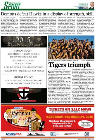 Demons defeat Hawks in a display of strength, skill BY JONATHAN BOX The 2015 Mininera and District Football League grand final was a great display of strength and skill between the league’s two powerhouses, but the day’s honours and the silverware went to Lismore- Derrinallum. After a long wait, it was LismoreDerrinallum’s first premiership since the club joined the competition. Tatyoon drew first blood with Rich Tucker kicking the first goal in the
