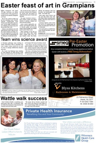 he Grampians will again offer art-lovers an Easter weekend feast with preparations in place for an annual Grampians Art Trail. The art trail, centred on Halls Gap but also including Ararat, Stawell, Wartook, Landsborough, Great Western and Callawadda, again features several highly acclaimed artists exhibiting and showcasing how they produce their work. Galleries and exhibition areas will open between 10am to 4pm on every day of the weekend, providing visitors with insight into art works and a chance to gain an understanding of the influences of individual artists.