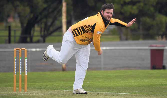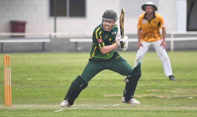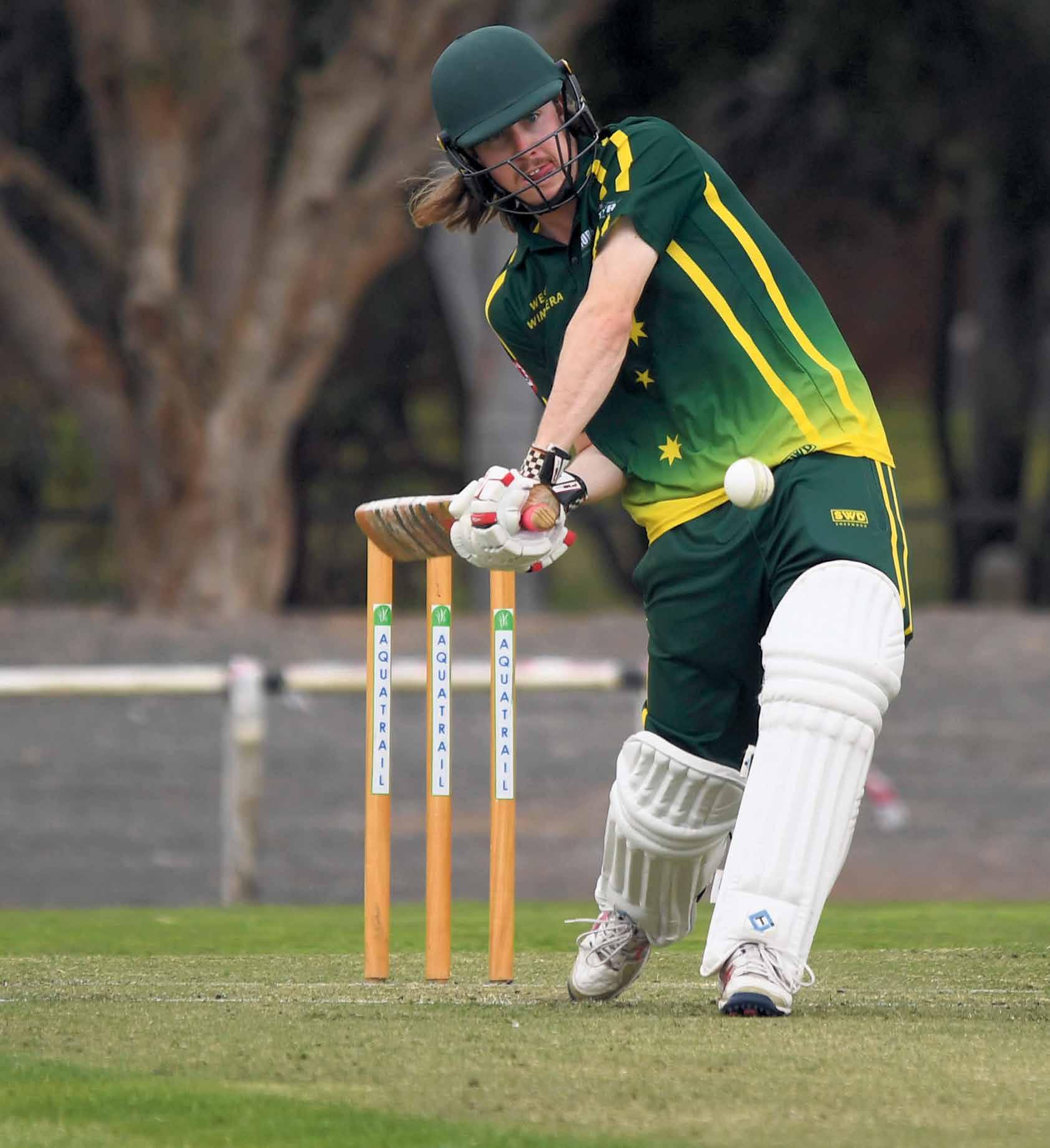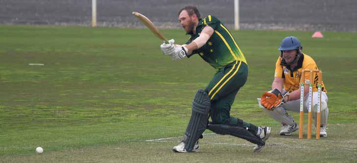 West Wimmera’s Liam Preston launches into a Dale Dridan delivery during Horsham Cricket Association’s A Grade competition at Horsham City Oval on Saturday. The Warriors dominated the rain-shortened match, making 7-262 including big scores from Nathan Alexander, 116, and Preston, 45. The Tigers followed up with