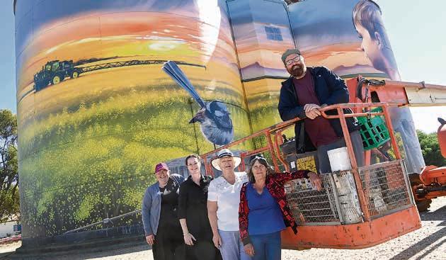 Rupanyup’s silo art has been renewed by street artist Smug, after fading and rusting affected the original work. Julia Volchkova’s 2017 painting depicted sporting identities Ebony Baker and Jordon Weidemann. Smug, who also painted silos at Wirrabara, Nullawil, Arkona, Horsham, Murtoa and Lameroo, portrays a farming landscape in his latest work. He is pictured with supporters Regina Johnstone and Kelly Oxbrow of Rupanyup and Minyip Community Bank, Rupanyup Progress Association’s Carmel Healy and Yarriambiack councillor Corrine Heintze. Picture: PAUL CARRACHER