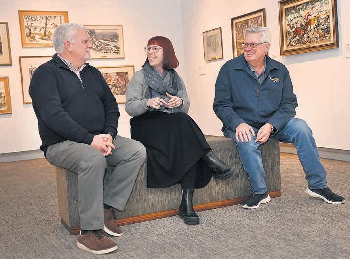 OPPORTUNITY: Horsham East Rotary Club members Peter Robertson, left, and Gary Green chat to 2025 Wimmera Art Fair judge Lauren Larkin. Picture: PAUL CARRACHER