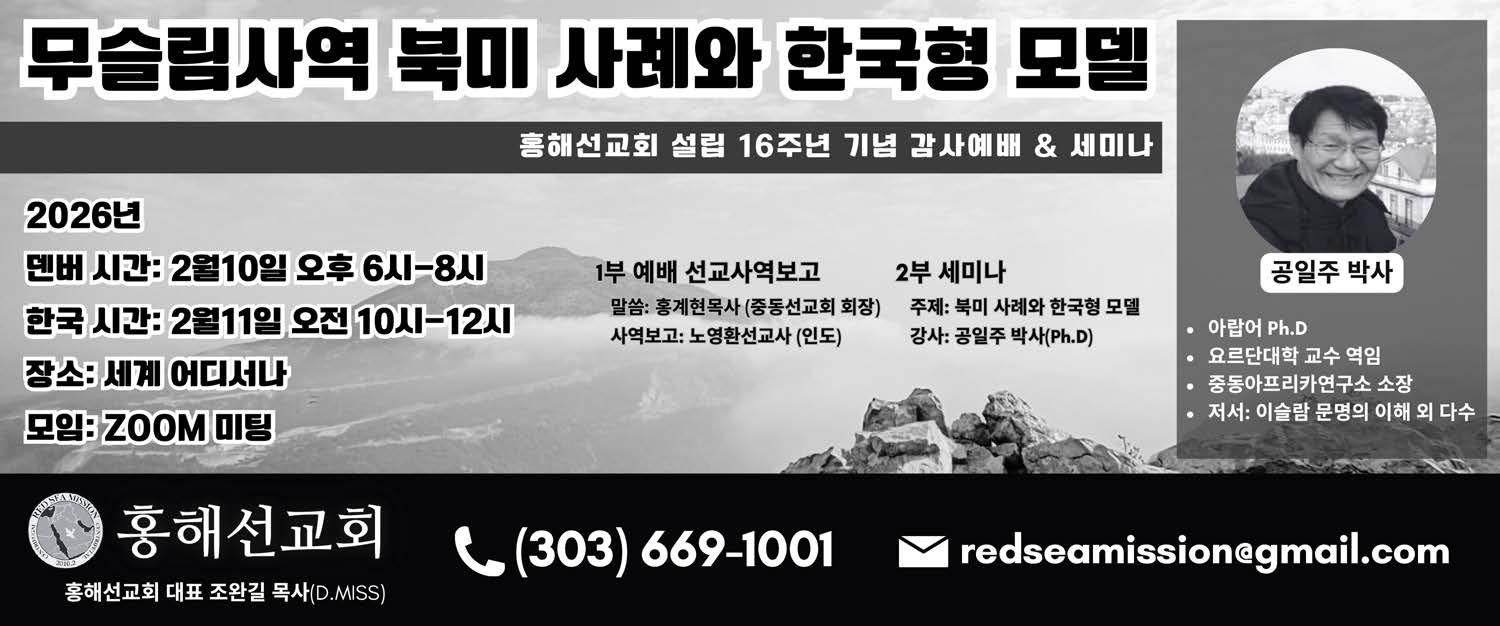 홍해선교회 16주년 기념 감사예배 2월10일 오후 6시~8시 홍해선교회(대표 조완길 목사)가 16년을 맞아 감사예배 및 세미나를 개최한다. 행사는 줌미팅으로 진행되며 덴