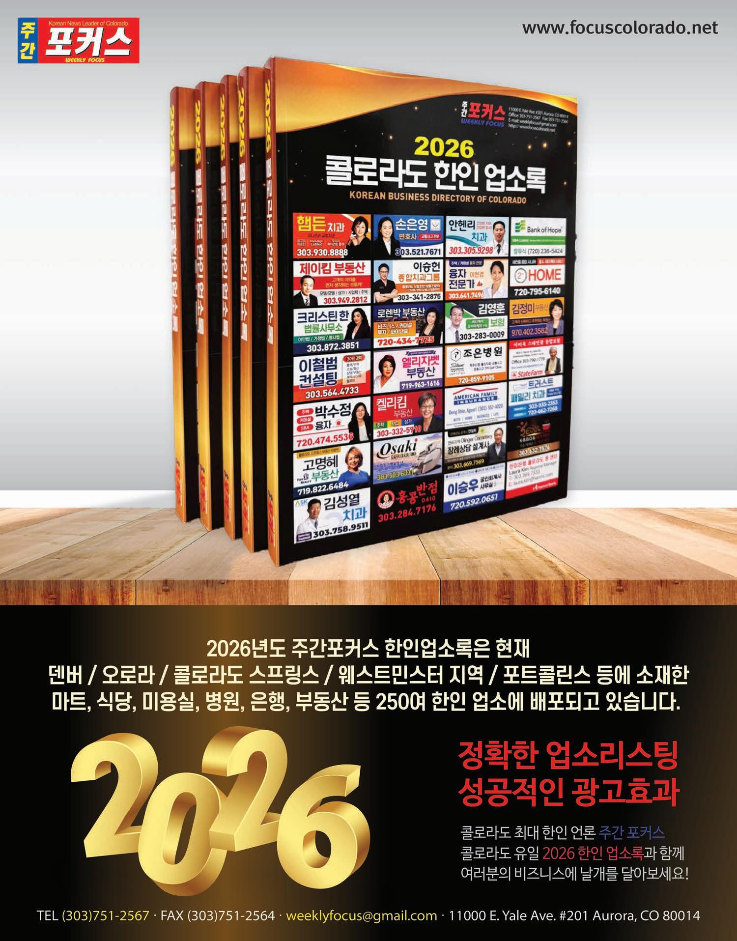 콜로라도 한인사회에서 유일하게 발행되고 있는 <주간포 커스 발행 2026년 콜로라도 한인업소록>이 오로라 한인타