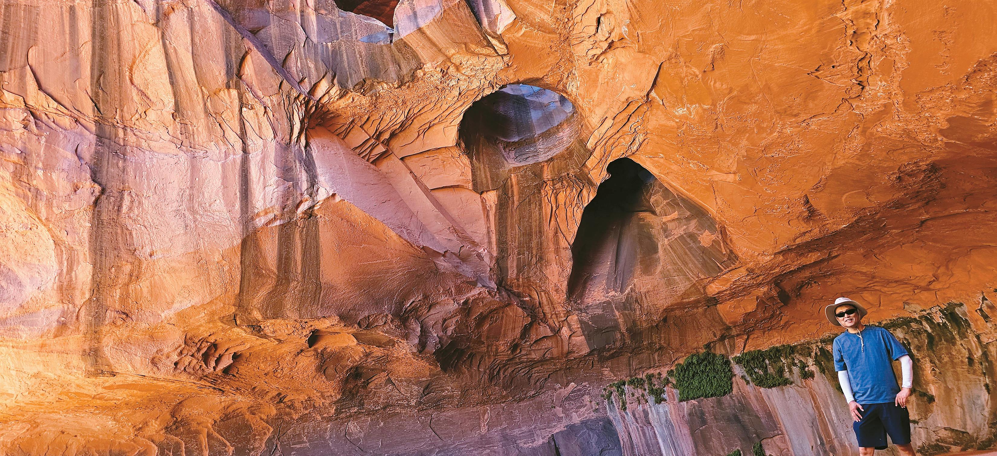 브라이스캐년서 1시간 운전 왕복 10마일 등반 험한 여정 모래밭협곡강 거쳐 도착 마지막길 암벽따라 올라가면 햇빛비춘 붉은바위 천장 절경