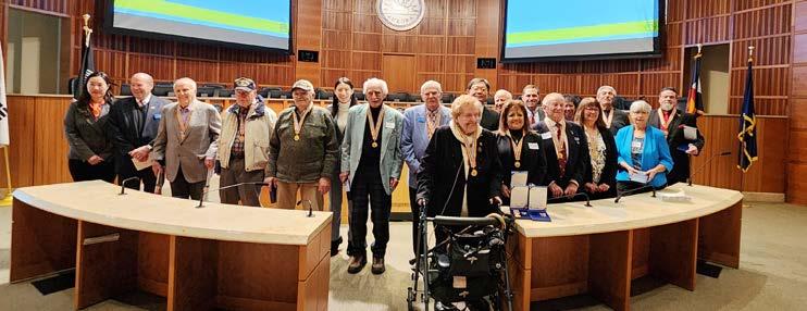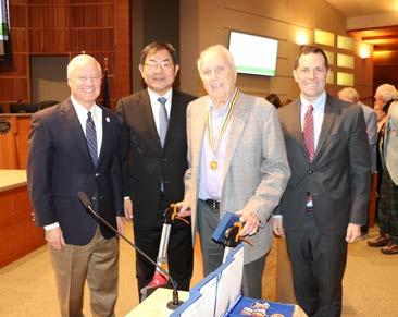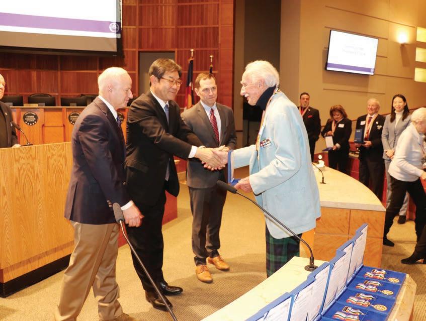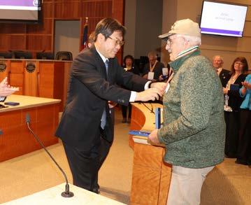 윤상수 샌프란시스코 총영사와 마이크 코프만 시장, 제이슨 크로우 의원이 18명의 한국전 참전 용사 및 유가족에게 감사와 존경의 마음을 담아 평화의 사도 메달을 전달하고 있다.