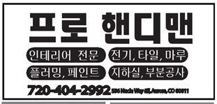 임동섭 김교철 유지훈 이동훈 이두화 조완길 김병수 목사 한용구 목사 선교사 담임목사 담임목사 담임목사 담임목사 목사 에콰도르 선교사 세계선교교회 참빛교회 삼성장로교회 풍성한교회 홍해선교회 믿음장로교회 향기나는 편지 Professional 서비스를 경험하세요. 블루오션으로 선도하겠습니다. 정직과 신용으로 최선을 다하여 봉사하겠습니다. 3090 S. Jamaica Ct. Ste 113, Aurora, CO 80014 Tel : 303-819-7763 지철 CPA 연세대학교 상경대학 졸업 연세대학교 경영대학원 MBA LG 경영대학원 MBA CU Denver MSIS www.icjcpa.com ▶ 각종 세금신고 / 세무감사 대행 ▶ POS / 전산시스템 구축 ▶ 신규회사 설립 서비스 ▶ AML Compliance(첵캐싱 은행서류) Review ▶ 상속 / 증여세 컨설팅 ▶ Payroll ▶ 빌딩 / 사업체 위탁관리 3/2(목) 3/3(금) AURORA, CO 80014 기준 주간 날씨 예보 3/4(토) 3/5(일) 3/6(월) 3/7(화) 3/8(수) 최고 38 최저 24 최고 43 최저 19 최고 40 최저 22 최고 53 최저 25 최고 42 최저 25 최고 40 최저 25 약간 흐림 약간 흐림 눈 맑음 맑음 약간 흐림 목차 / 날씨 데스크 칼럼 지역 단신 콜로라도뉴스 미국 / 미주한인뉴스 한국뉴스 월드뉴스 반려동물과 함께살기 연예 / 스포츠 건강 골프 영화 슬기로운 가족생활 쉬어갑시다 신간베스트셀러 / 신간책 벼룩시장 한인업소안내 운세 9 12 14 16,24,26,28,30,36,38,40,48,50,52,53,54,60,62,64 72,74,75,76 84,86,87 88 97 96,98 99 101 108 109 110,111,112 114 121,122 124,125 126 약간 흐림 최고 49 최저 25